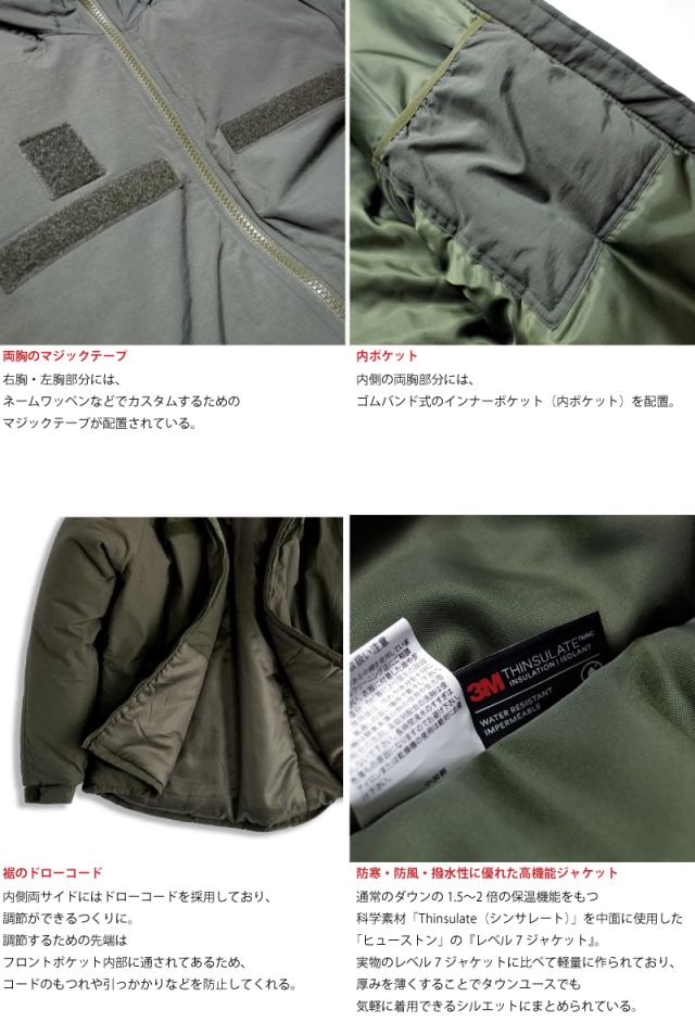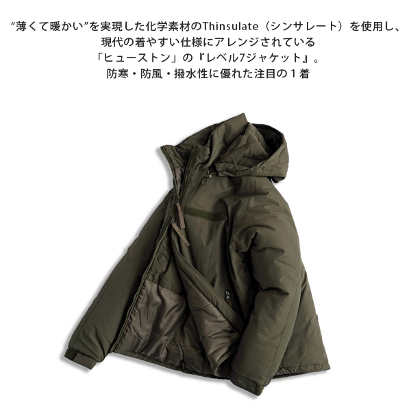著名人らが着用・紹介したことによって一気にその名が広く知られるようになったLEVEL 7 JACKET。 元々は米陸軍のECWCS(エクワックス)と呼ばれるレイヤリング(重ね着)システムがあり、 その最終レイヤーに位置するのがレベル7ジャケットです。 ECWCS(Extended Cold Weather Clothing System:拡張式寒冷地被服システム)では、 肌着などのレベル1〜最終アウターのレベル7までがあり、 それら全てを組み合わせることにより—50℃の環境下においても身を守ってくれるほどといわれています。 レベル7はその中でも最終レイヤーの寒冷地用被服であるためその保温性は極めて高いものに。 実物品では中綿に「PRIMALOFT/プリマロフト」が使用されていますが、 HOUSTONのレベル7ジャケットは価格を抑えながらも質は落とさず、中綿には薄く、 通常のダウンの1.5倍〜2倍の保温性をもつ「Thinsulate/シンサレート」中綿を使用。 さらに、表地にはナイロンシェルを採用し、防寒・防風・撥水効果も備わっています。 フロントポケットの内部にドローコードが付いており、シルエットの変更も容易に行えます。 また、裾を絞ることにより密閉性を高め、風の侵入を防いでくれます。 襟にはフードが内蔵されており、ベルクロを外して出すことも、収納することも可能です。 デイリーユースにも最適な一着に仕上がっています。 | ||||||