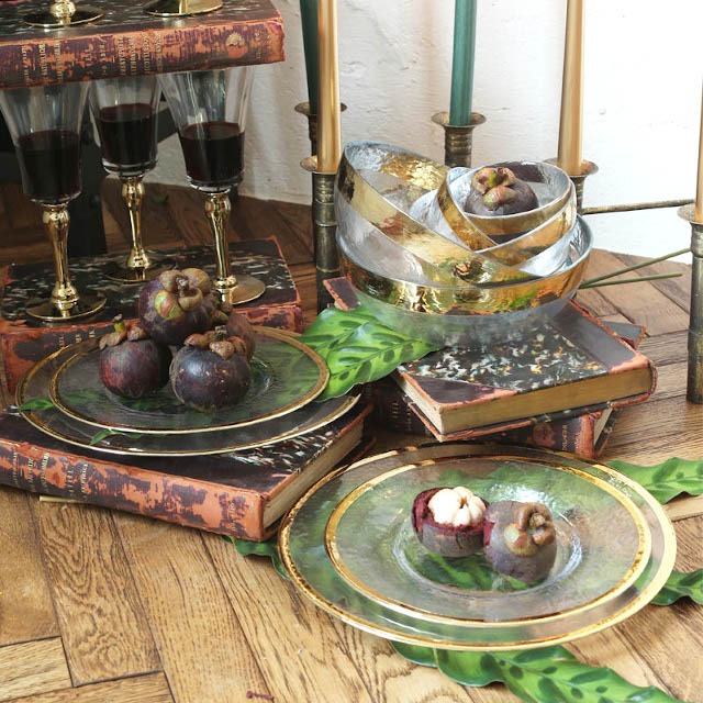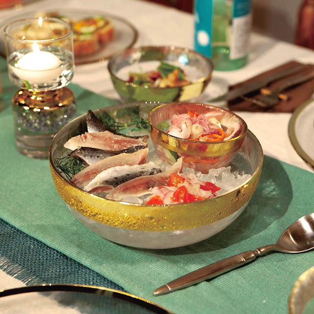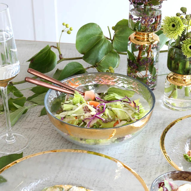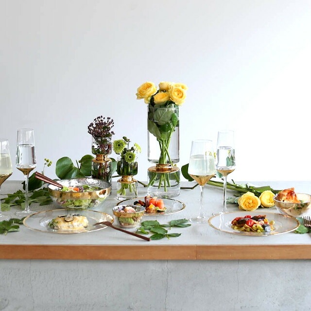 凹凸加工のガラスの淵に施されたゴールドのラインが、清涼感と高級感たっぷりで、みずみずしいメニューにぴったり。