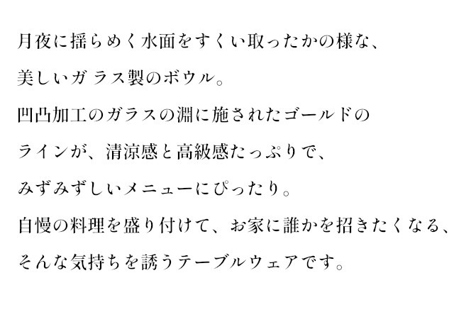月夜に揺らめく水面をすくい取ったかの様な、美しいガラス製のボウル。 |