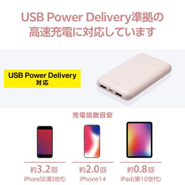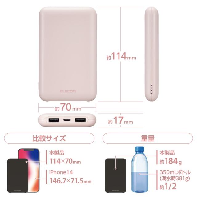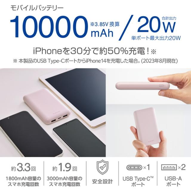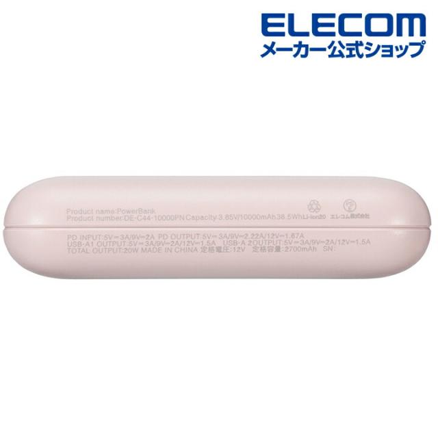 エレコム モバイルバッテリー 薄型 コンパクト 10000mAh 大容量 C×1+A×2 PD 20W ピンク┃DE-C44-10000PN