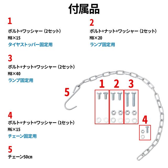 セット内容:ラダーレール本体、ランプ、タイヤストッパー、フック付きチェーン、ランプ固定用BT/N/W(M8×40、M8×20)各2セット、タイヤストッパー固定用BT/W(M8×15)2セット、
