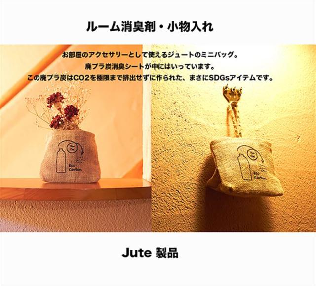 | 商品説明 | ・防臭・防虫効果があるジュート素材のミニバッグの中に抗菌・防臭効果の高い廃プラ炭(活性炭)シートを入れたお部屋飾りとして使える消臭ルームアクセサリー。 ・ この廃プラ炭(活性炭)シートは、CO2の排出を極限まで減らして作られた地球にやさしいシート。 ・ミニバッグは小物入れとして、別の用途でも使えます。またみにバッグはジュートで作られており、ジュートは生息時、通常の木に比べて5〜6倍CO2吸収量が多く成長が早い植物。 ・活用されずに伐採すると燃やすしかないため吸収してくれたCO2を排出しなければならない。 ・消臭効果が期待できて生分解性も高い植物です。 |
