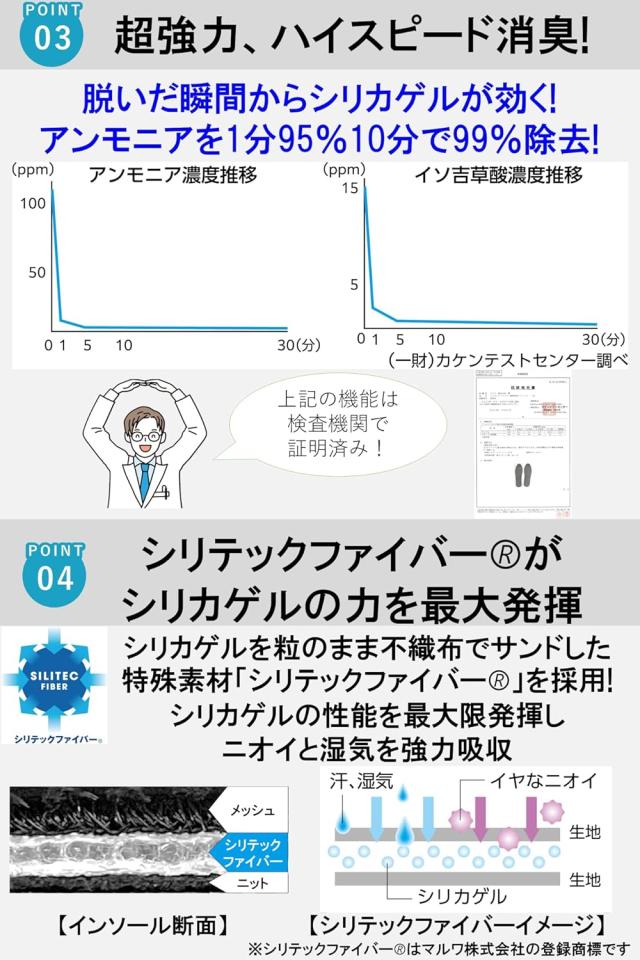 シリカゲルの力で蒸れ防止、足臭の消臭をします。天日干しで機能が再生し、繰り返し使えるのが特徴です。 |