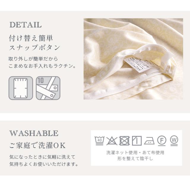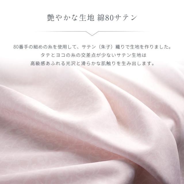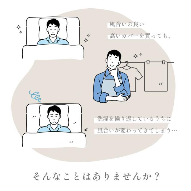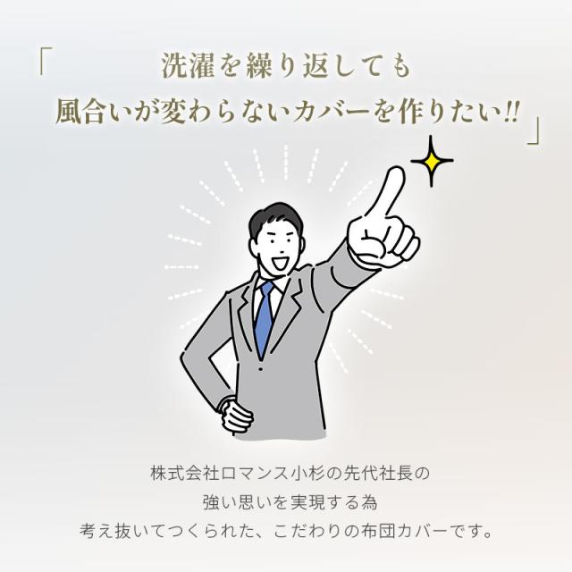 | ・高スペックの羽毛布団ほどカバーが重要 羽毛は寒くなると羽枝を伸ばして空気を取り込み、ふわふわと膨らんで暖かな空気を溜め込みます。せっかく良い羽毛布団を選んでも、布団を包むカバーが重たく通気性のないものだと、羽毛の心地よさを充分に引き出すことができません。スペックの高い羽毛布団ほど、その保温力と心地よさを充分に引き出すために、品質の高いカバー選びが大切です。 ・繰り返し洗濯してもソフトな風合いを維持特殊な超微起毛加工により毛足の長さが均一になり、なめらかで美しいタッチで、艶やかな光沢感を実現しています。繰り返し洗濯しても、ソフトな風合いはほとんど変わりません。 ・艶やかな生地80サテン80番手の細めの糸を使用し、サテン(朱子)織りで生地を作りました。タテとヨコの糸の交差点が少ないサテン生地は、高級感あふれる光沢と滑らかな肌触りを生み出します。 ・ロマンス小杉の高品質商品老舗寝具メーカー「ロマンス小杉」で丁寧に造られた商品です。高い技術と品質で、どなたにでも安心してお使いいただける商品に仕上がりました。 | |