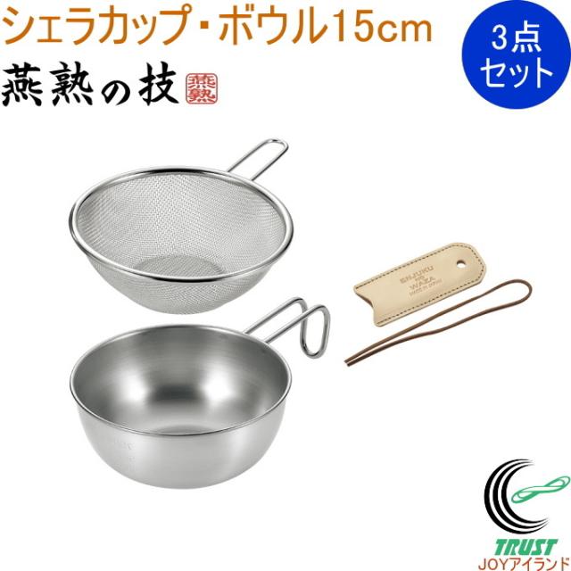 燕熟の技 シェラカップ・ボウル15cm&手付きザル・レザーカバー付き EJSB-550 送料無料 日本製 燕三条産 ハンドルカバー カバー 牛革 ザル シェラカップ メスティン フライパン ケトル キャンプ アウトドア BBQ 便利 セット
