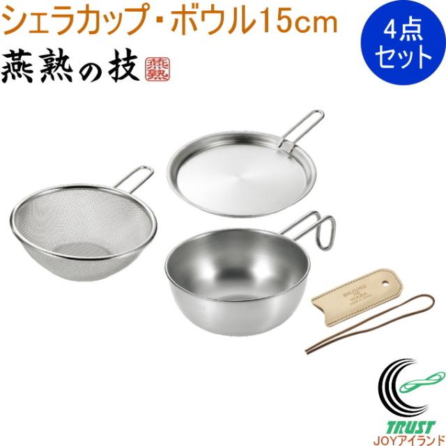 燕熟の技 シェラカップ・ボウル15cm&手付きザル・蓋トレー・シリコン蓋・レザーカバー付き EJSB-750 送料無料 日本製 燕三条産 ハンドルカバー 牛革 ザル 蓋トレー シリコン蓋 シェラカップ メスティン フライパン ケトル キャンプ アウトドア BBQ 便利 セット