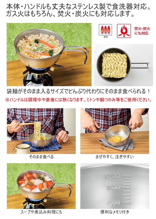 金属加工の街、新潟県燕市で作られた信頼の日本製。 本体・ハンドルも丈夫なステンレス製で食洗器対応。 ガス火はもちろん、焚火・炭火にも対応します。 袋麺がそのまま入るサイズでどんぶり代わりにそのまま食べられる。 スープや煮込み料理にも。 水切りや湯切りに便利な手付きザルはストロングメッシュタイプ。 トレーとしても使える蓋、保存に便利なシリコン蓋付きです。 ※ハンドルは調理中や直後には熱くなります。ミトンや鍋つかみ等をご使用ください。 |