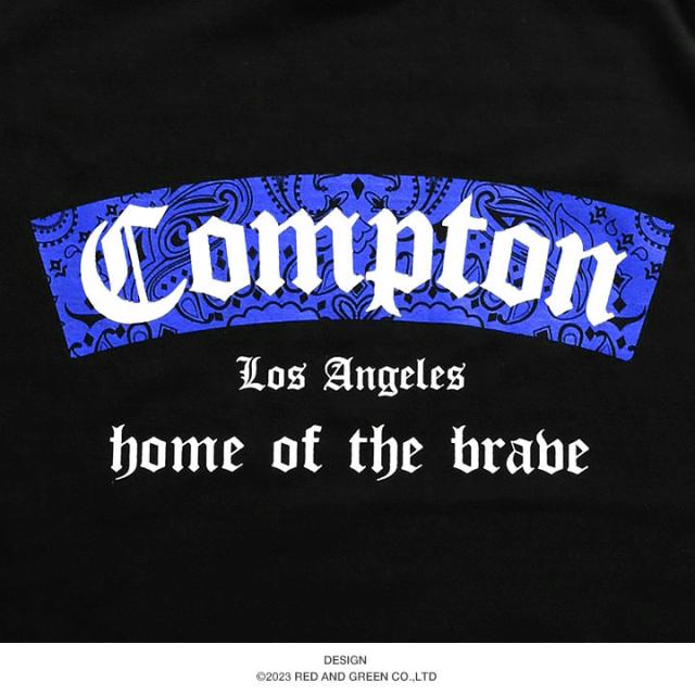 Comptonの背景に施されたペイズリー柄のボックスロゴや、Comptonと共に刻印された、サグの故郷を表す「home of the brave」もポイント。