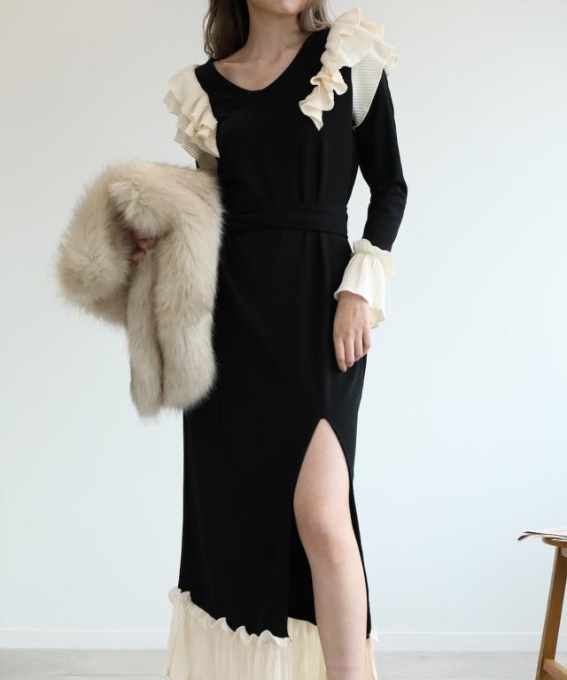 細かいプリーツの入ったフリルに、少しカジュアルな素材のワンピースなのでエレガント過ぎず、普段使いもしていただけます。