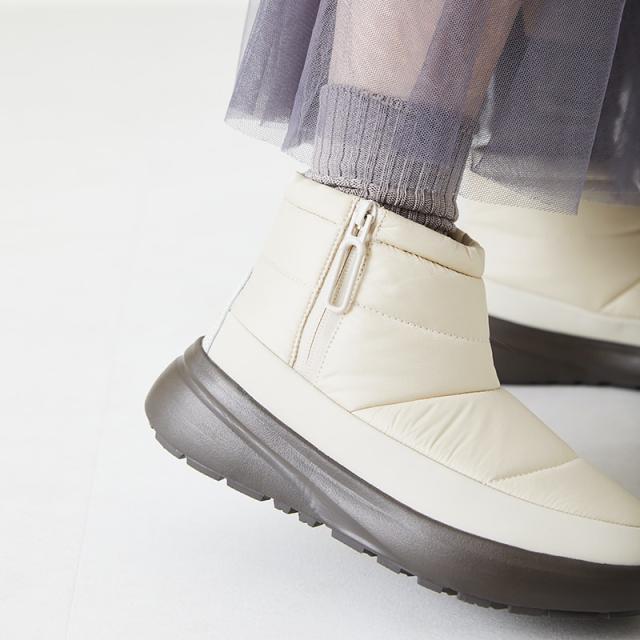 大きめのファスナーやダウンのような見た目が目を引く1足。