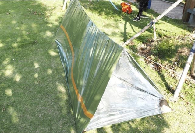 2.テントにロープを通し、木や柱にロープを結びつけます。
