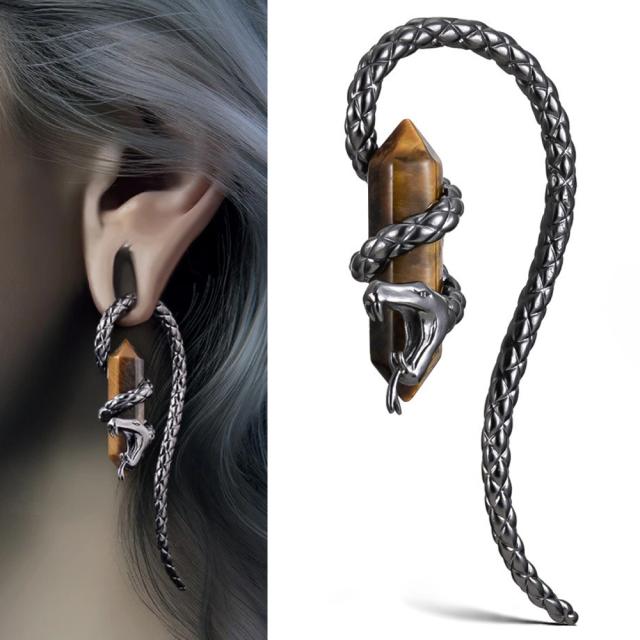 真鍮製の黒色ブラックメッキした蛇が天然石のタイガーアイに絡みついたユニークな6ゲージのフック型ボディピアス。