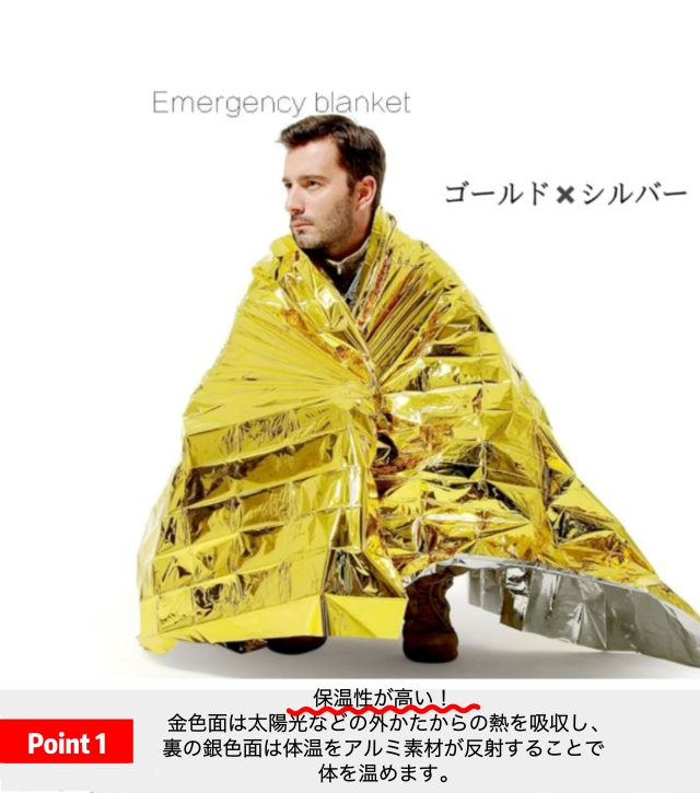 アルミ蒸着シートで体を包むと温かい。人体の熱は体表面から赤外線で逃げていき、金属にあたると反射する性質があります。