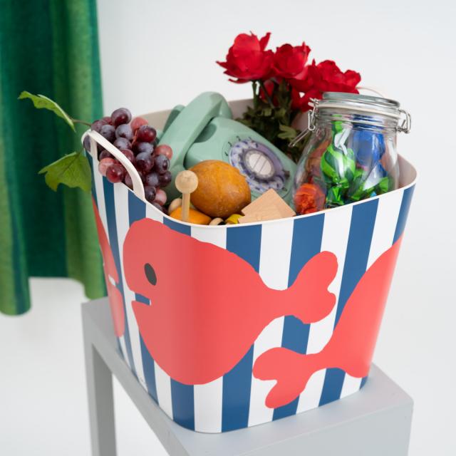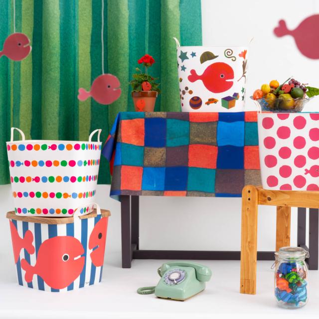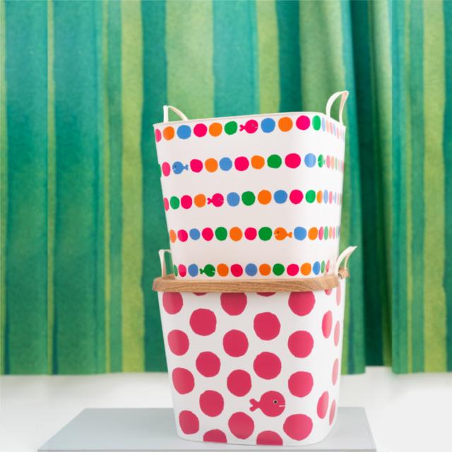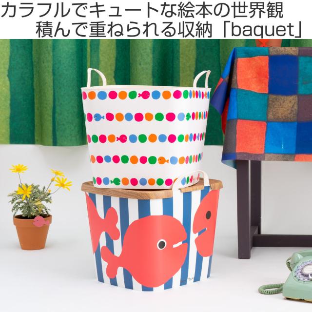 積み重ねて収納が出来る、「stacksto, (スタックストー)」 のbaquet (バケット) Mサイズと、五味太郎さんの絵本「きんぎょがにげた」とのコラボレーションです。大きくプリントされたり、ドット柄のなかに逃げ込んでみたり・・・見たら思わず「可愛い!」と声に出してしまう、カラフルでキュートな「きんぎょがにげた」デザインの収納グッズをインテリアシーンにも。