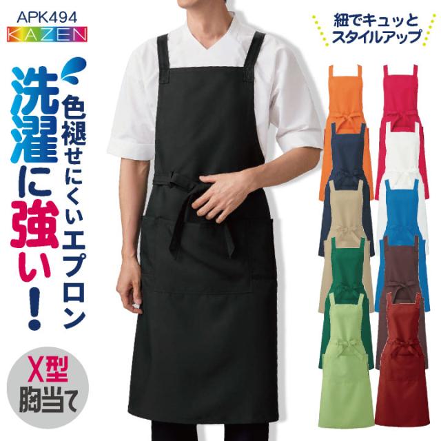 KAZEN カゼン 胸当てエプロン X型 腰ひも付 耐塩素 退色防止 洗濯に強い ポリエステル100% サービス カフェ 飲食業 厨房 保育士 介護士 ネコポス kz-apk494-c4