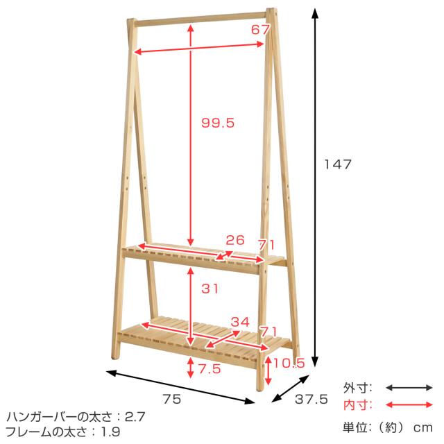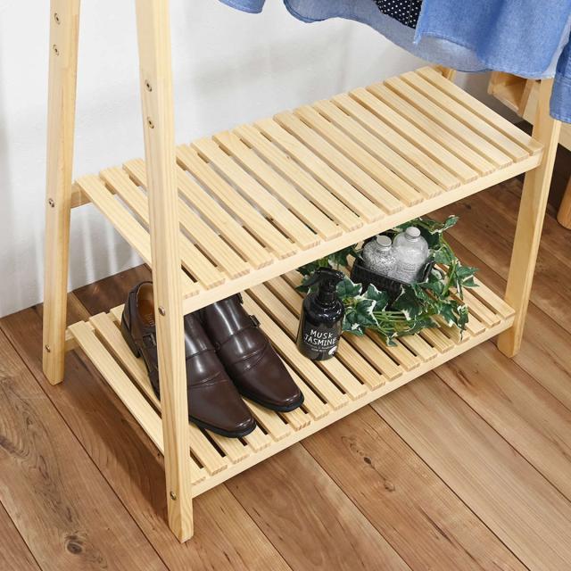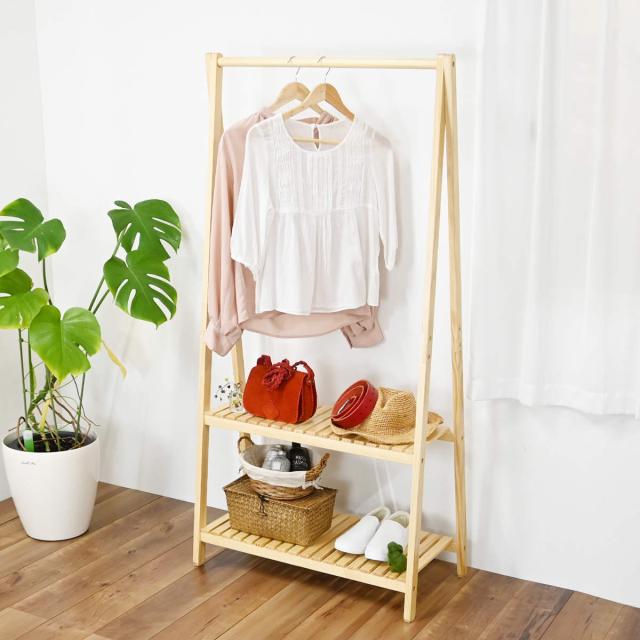 ハンガーラック A型 2段棚付 天然木フレーム 幅75cm ( ハンガー ラック 収納 家具 棚 二段 天然木 コート掛け 衣類 ハンガーポール 洋服収納 コートハンガー ナチュラル 棚付 )