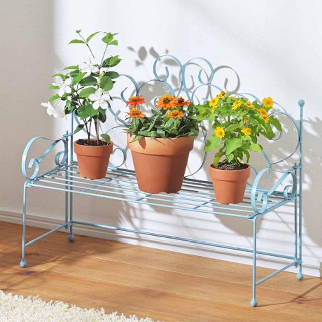 ベンチの形をしたおしゃれなフラワースタンドです。水色のアイアン調フレームがアクセントになるアイテムです。