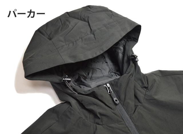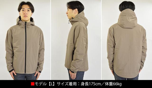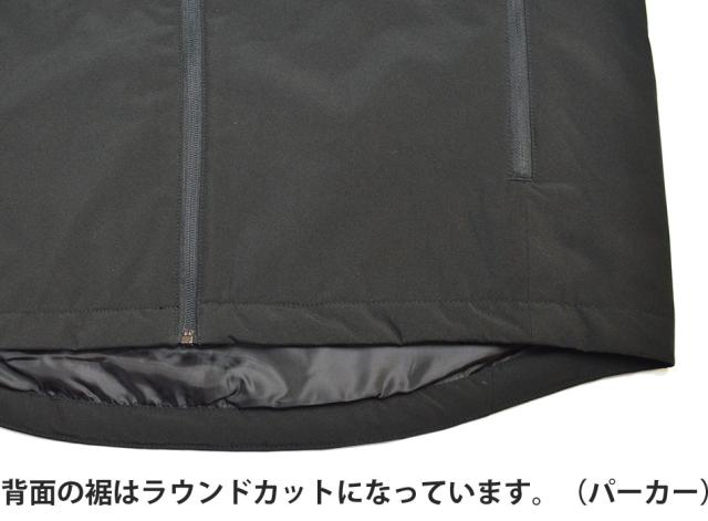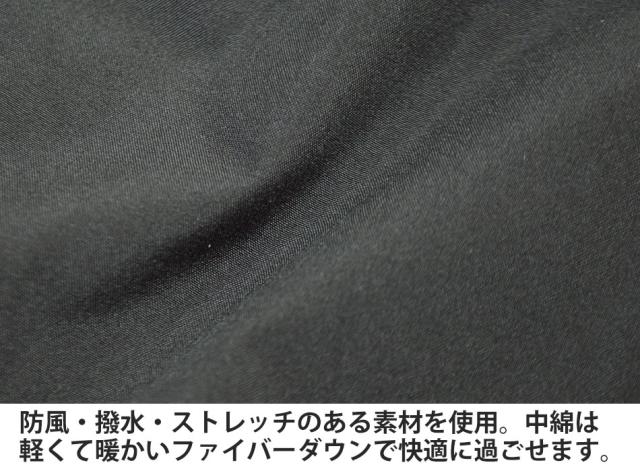 表地:ポリエステル100%(防風撥水ストレッチ)/ 裏地:ポリエステル100%(タフタ) 中綿:ポリエステル85% レーヨン15%(レーヨン混ファイバーダウン)