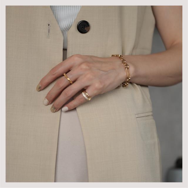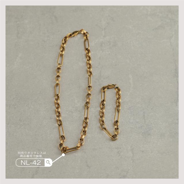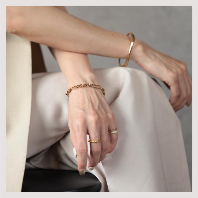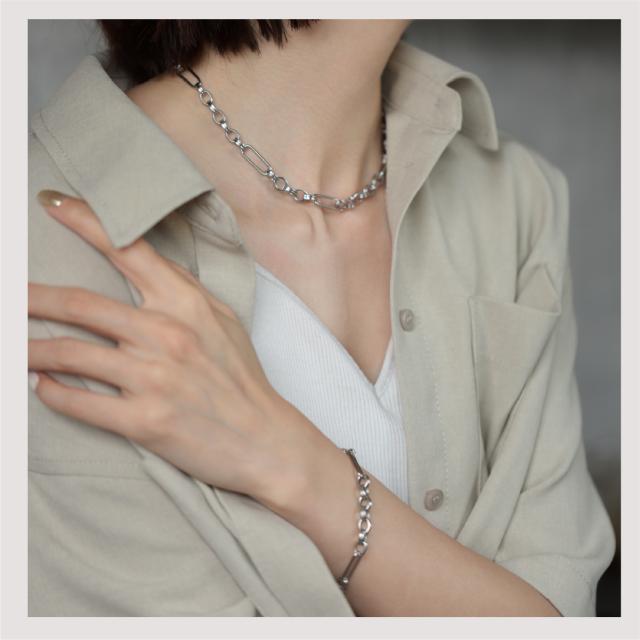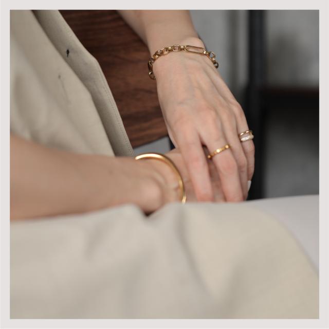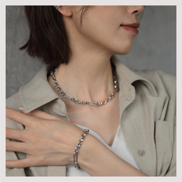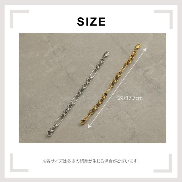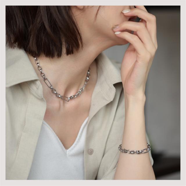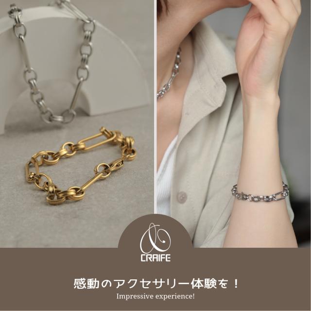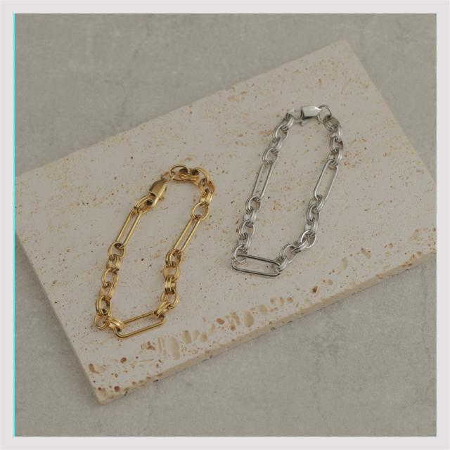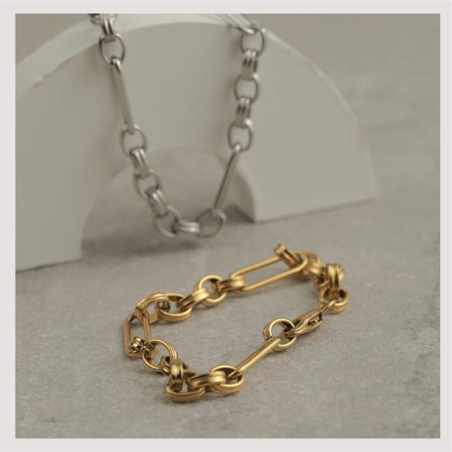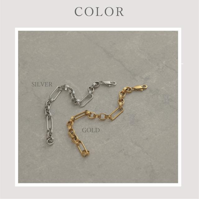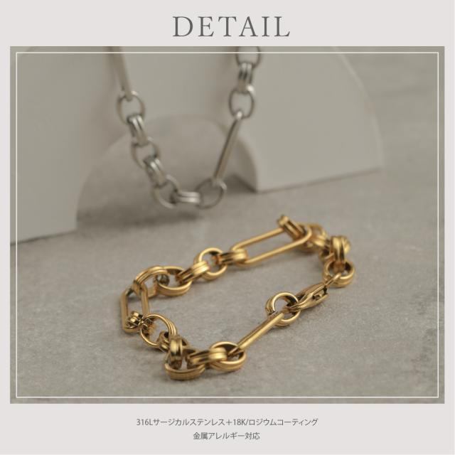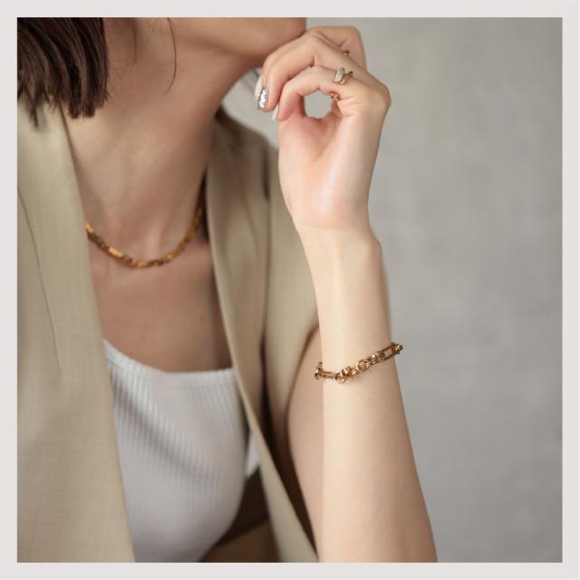 特徴:トレンド感あるチェーンデザインが特徴のブレスレットです。華奢でもなく、ゴツゴツ感もそれほどなく、使いやすいサイズ感の仕上がりとなっています。サージカルステンレス製で作られており、高品質な18Kのゴールドコーティング(シルバーはロジウムコーティング)が施されています。洗練されたスタイルでありながらも、様々なシーンにもマッチする一品です。さらに、同じデザインのネックレスもラインナップされており、セットで身に着けることで統一感のあるスタイリングを楽しむことができます。
