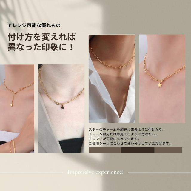 特徴:アレンジ可能な優れもの 付け方を変えれば異なった印象に!スターのチャームを胸元に来るように付けたり、チェーン部分だけが見えるように付けたり、アレンジが可能になっています。ご使用シーンに合わせて使い分けしていただけます。