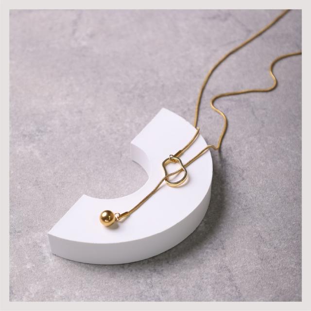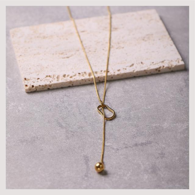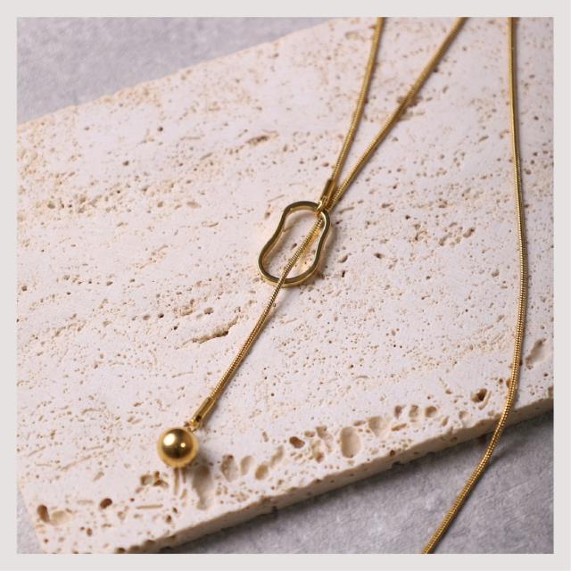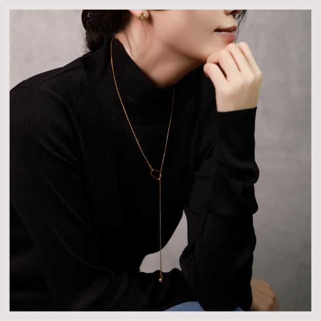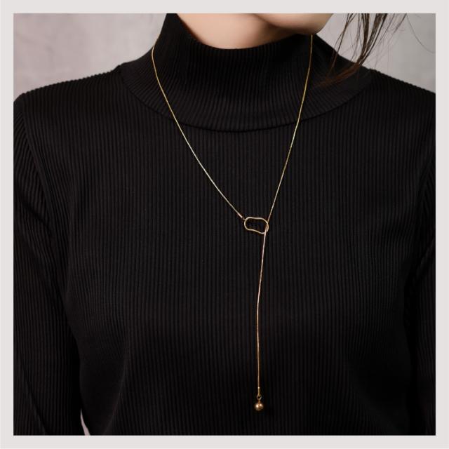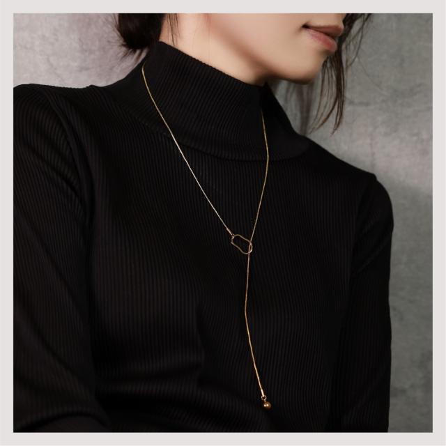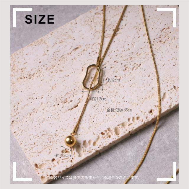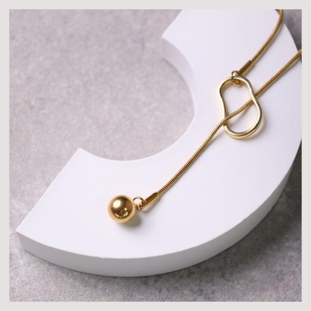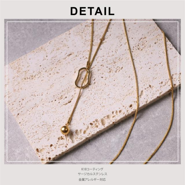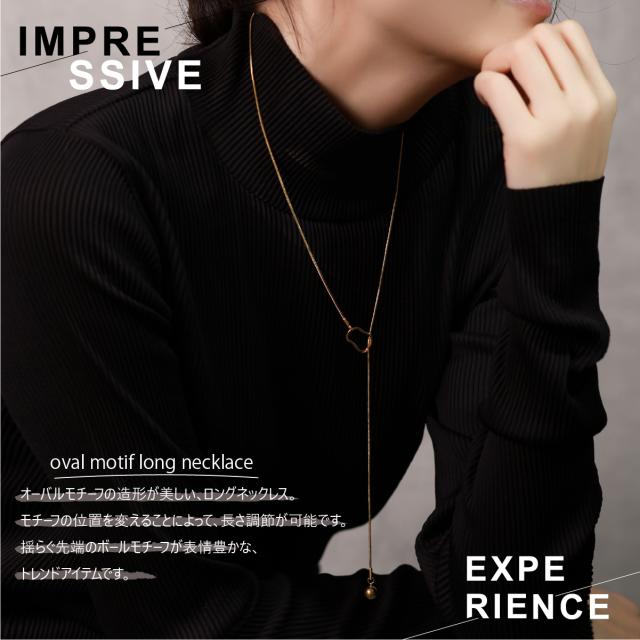 特徴:オーバルモチーフの造形が美しい、ラリエットネックレス (ロングネックレス)。モチーフの位置を変えることによって、長さ調節が可能です。揺らぐ先端のボールモチーフが表情豊かな、トレンドアイテムです。