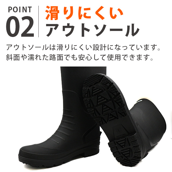アウトソールは滑りにくい設計になっています。斜面や濡れた路面でも安心して使用できます。