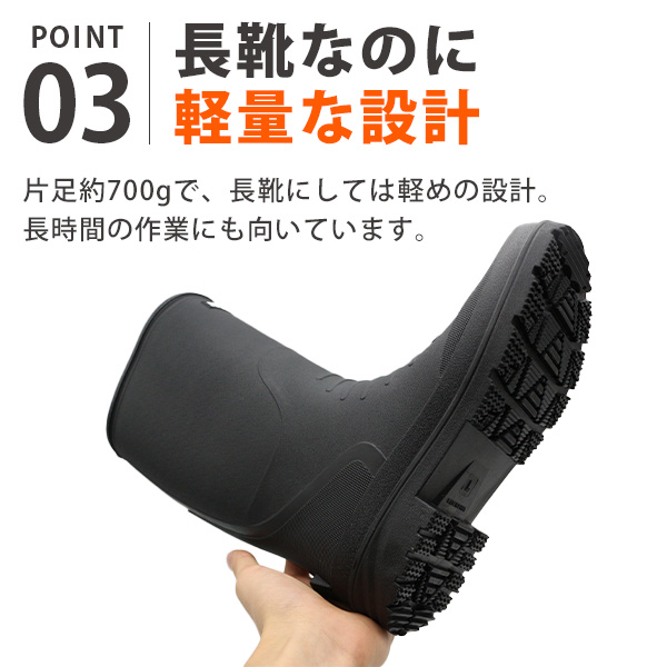 片足約700gで、長靴にしては軽めの設計。長時間の作業にも向いています。