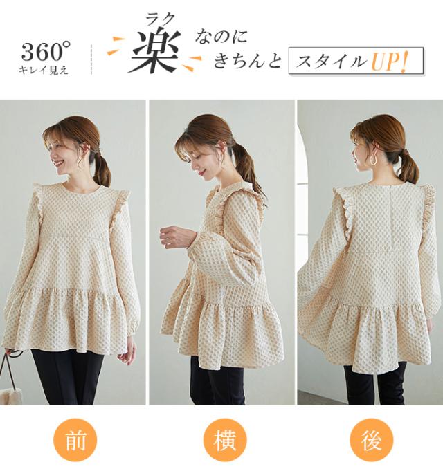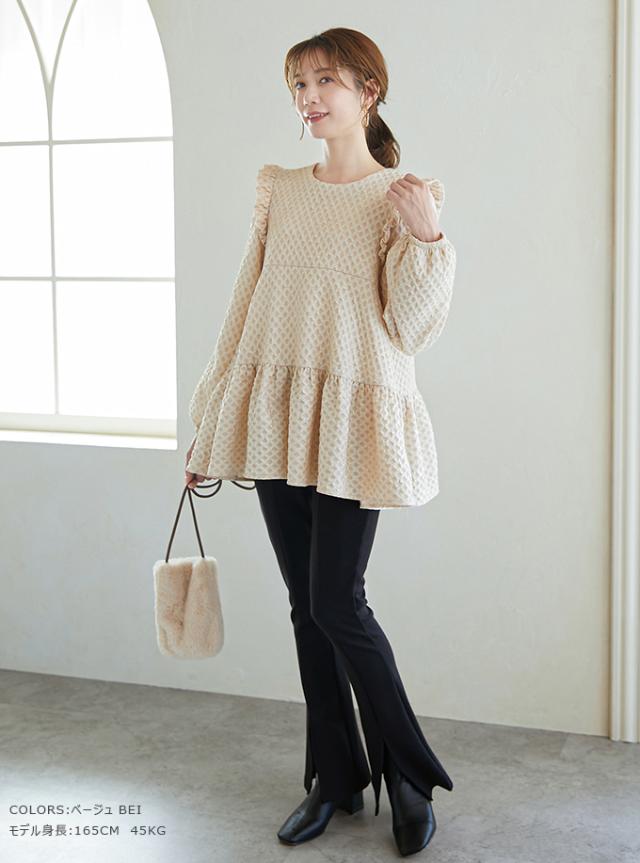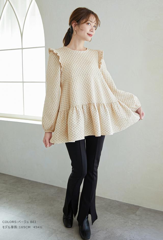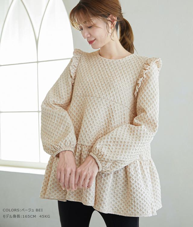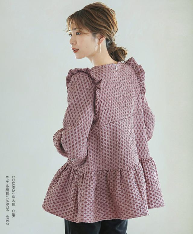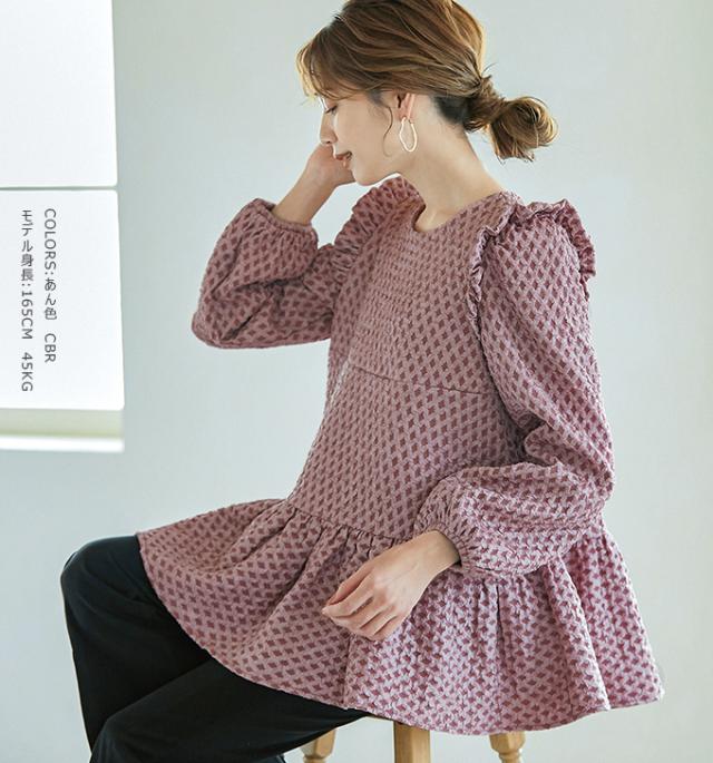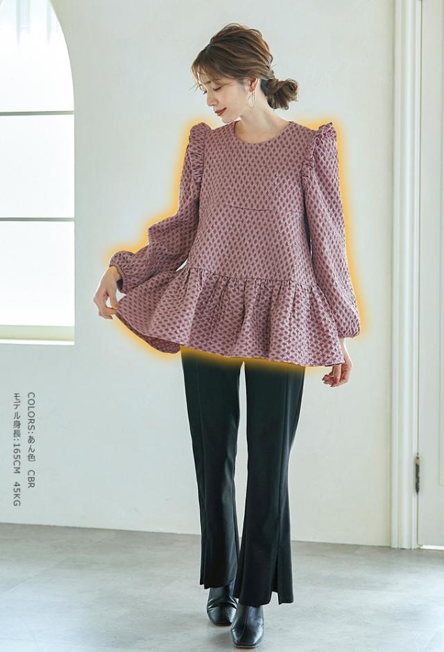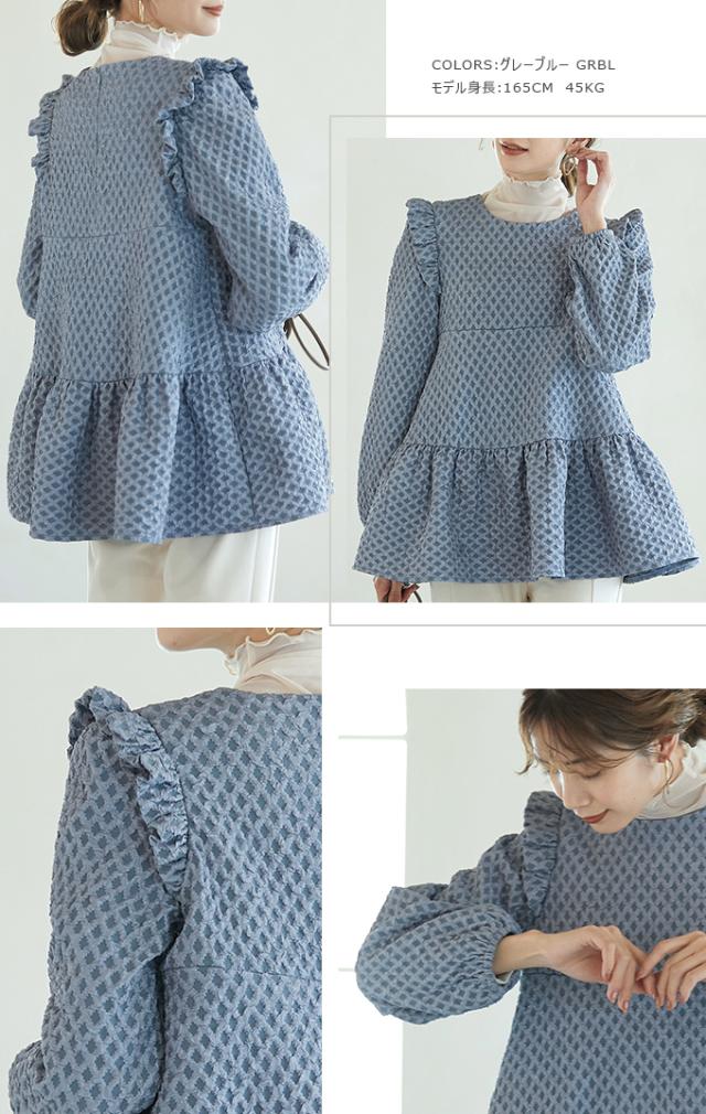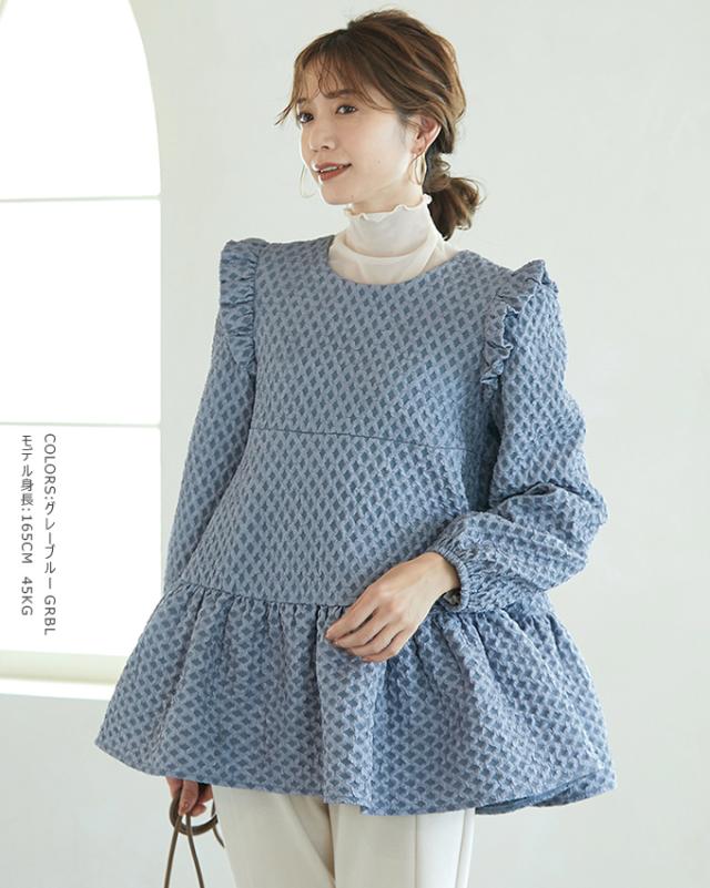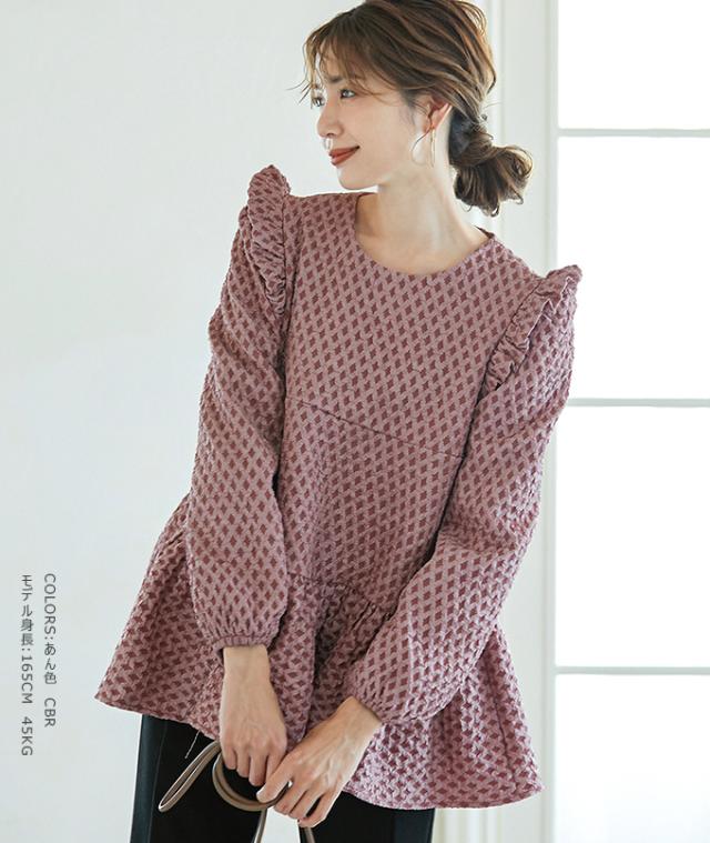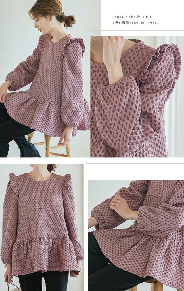 Karei 裏起毛ジャガードトップス 立体感ダイヤ柄 肩フリル ふんわり 体型カバー ゆったり 大人可愛い 30代 40代 50代