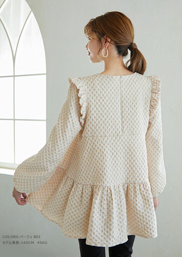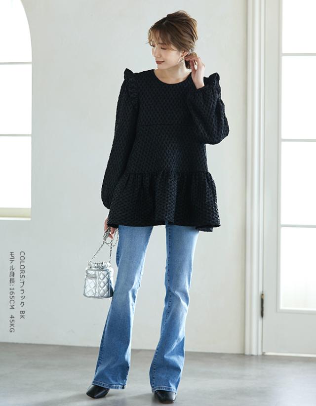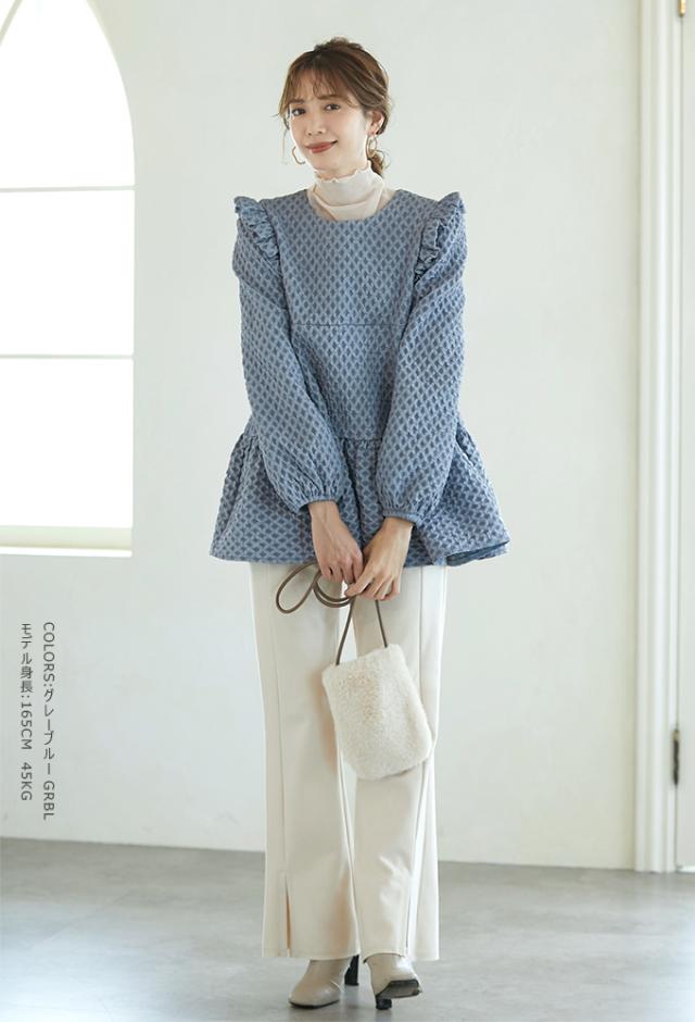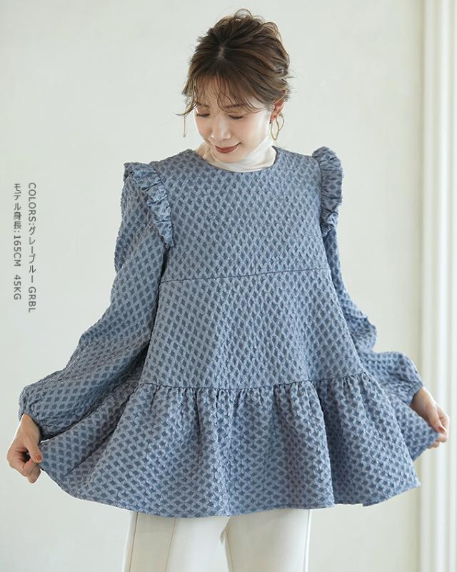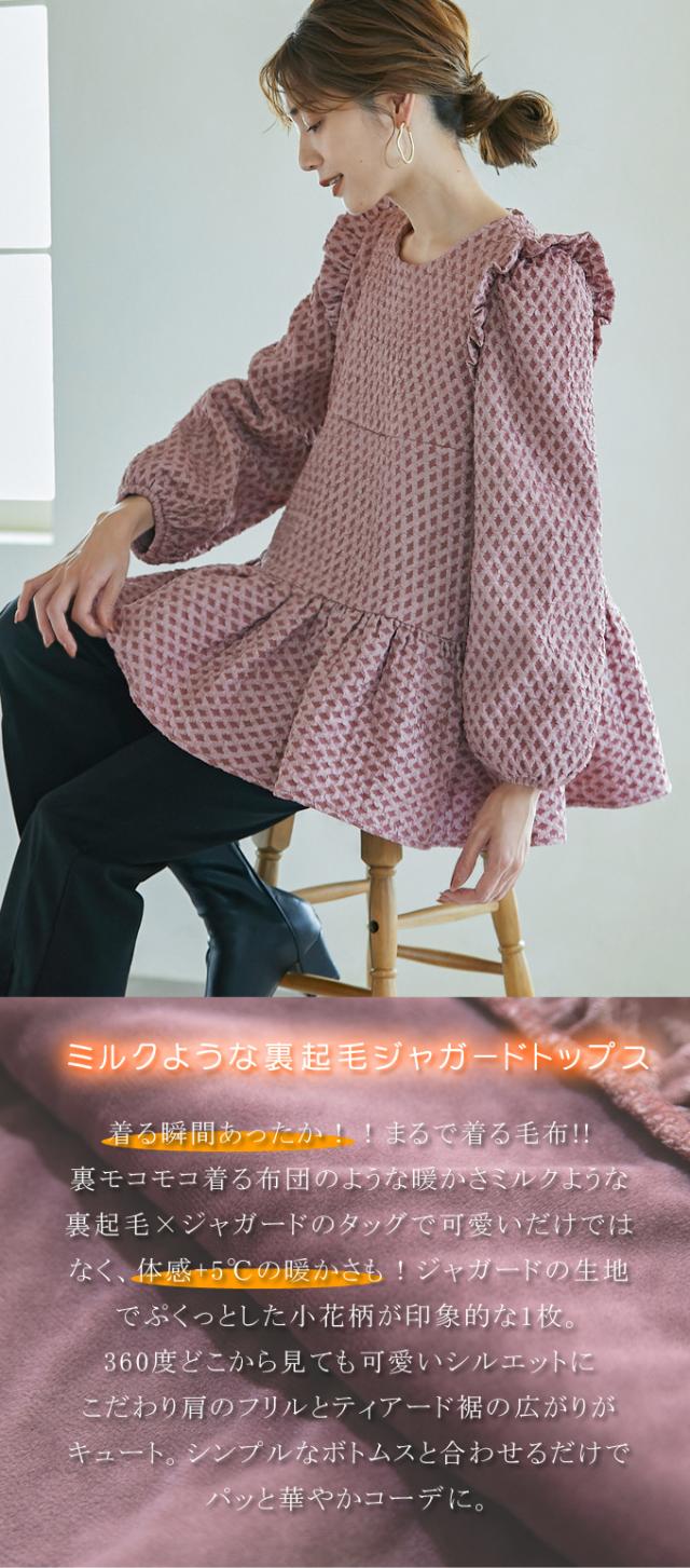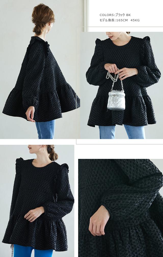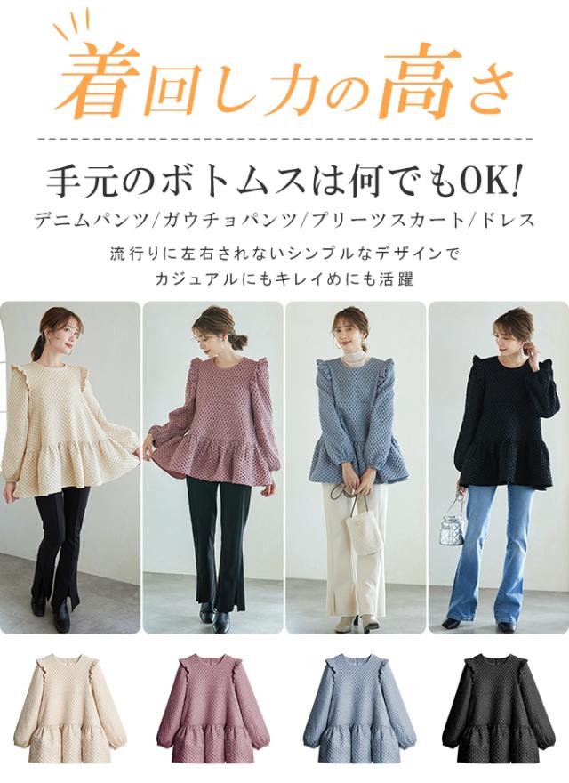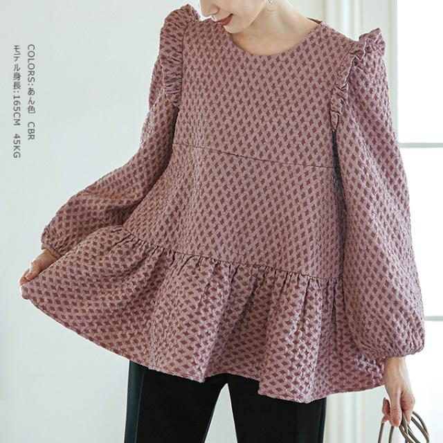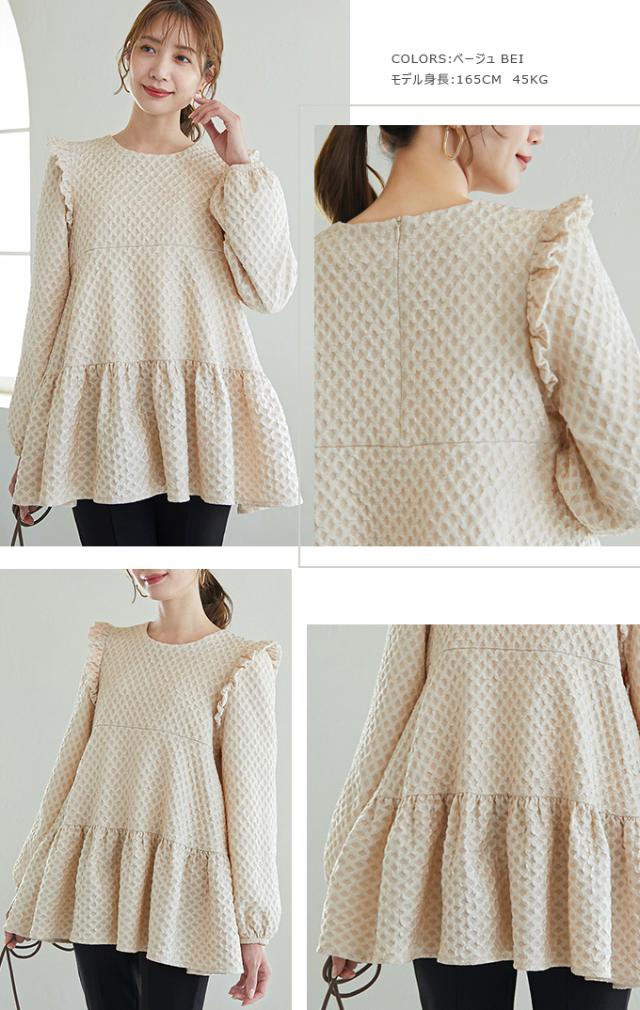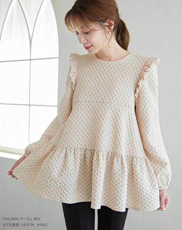 Karei 裏起毛ジャガードトップス 立体感ダイヤ柄 肩フリル ふんわり 体型カバー ゆったり 大人可愛い 30代 40代 50代