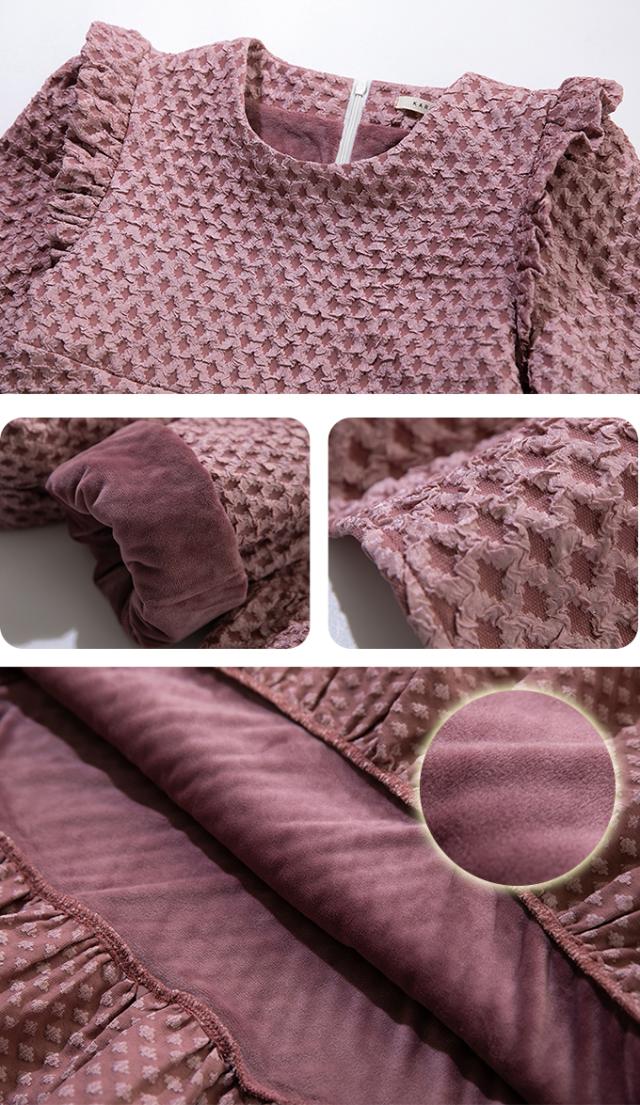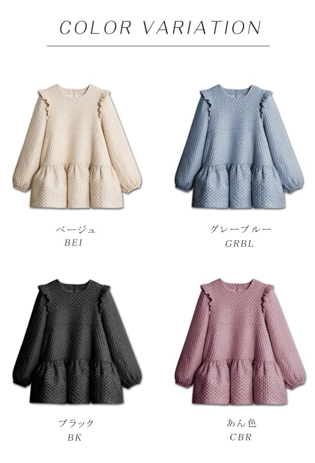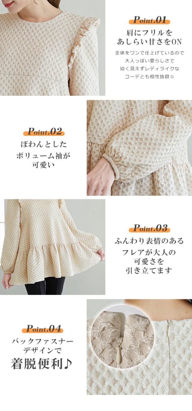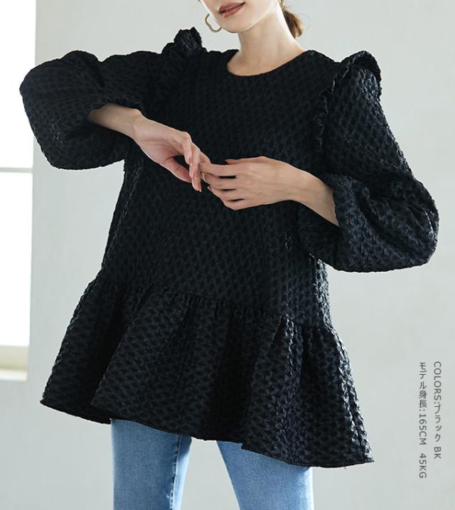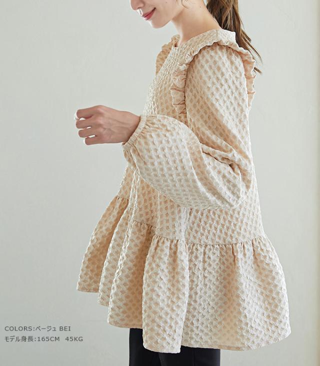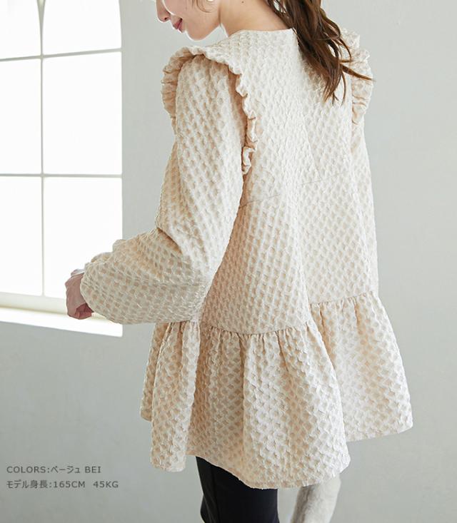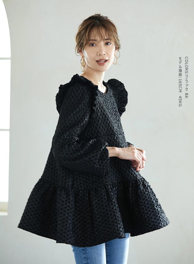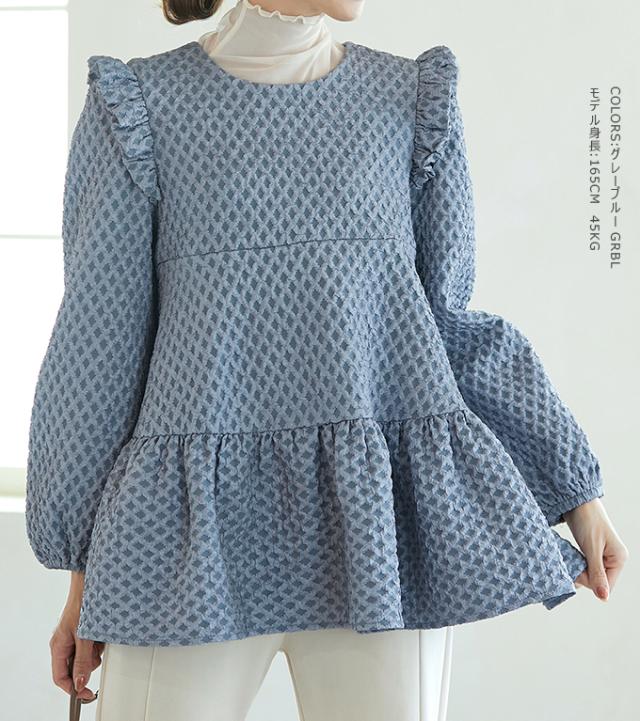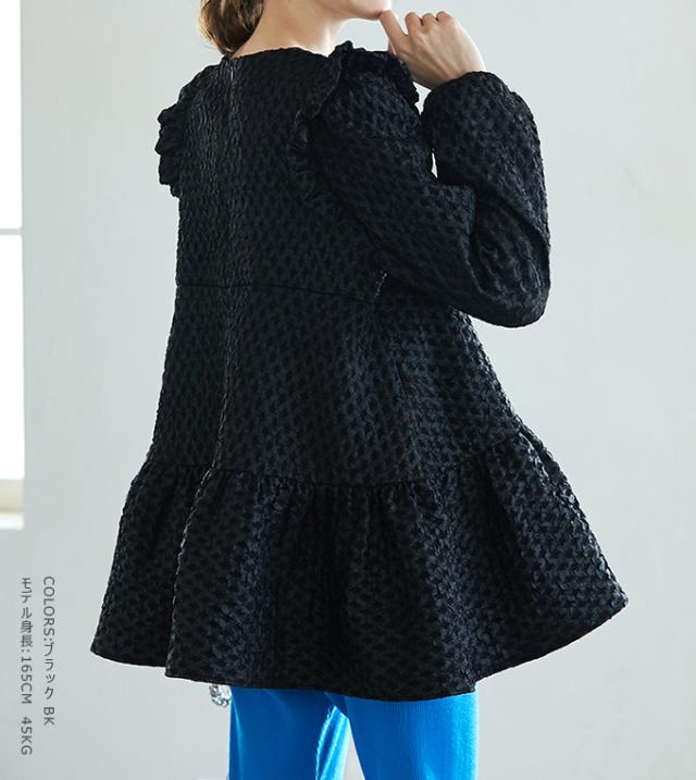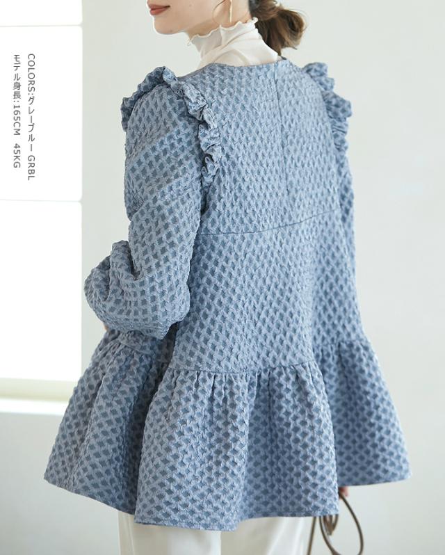 Karei 裏起毛ジャガードトップス 立体感ダイヤ柄 肩フリル ふんわり 体型カバー ゆったり 大人可愛い 30代 40代 50代