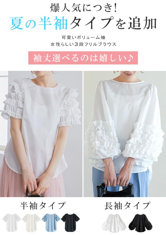 半額で 2490円、ブラウス ボリュームフリル袖ブラウス ボリューム袖ブラウス フリル 3段フリル ボリューム袖 トップス 大人プルオーバー 大人可愛い オシャレ 体型カバー ゆったり レディース