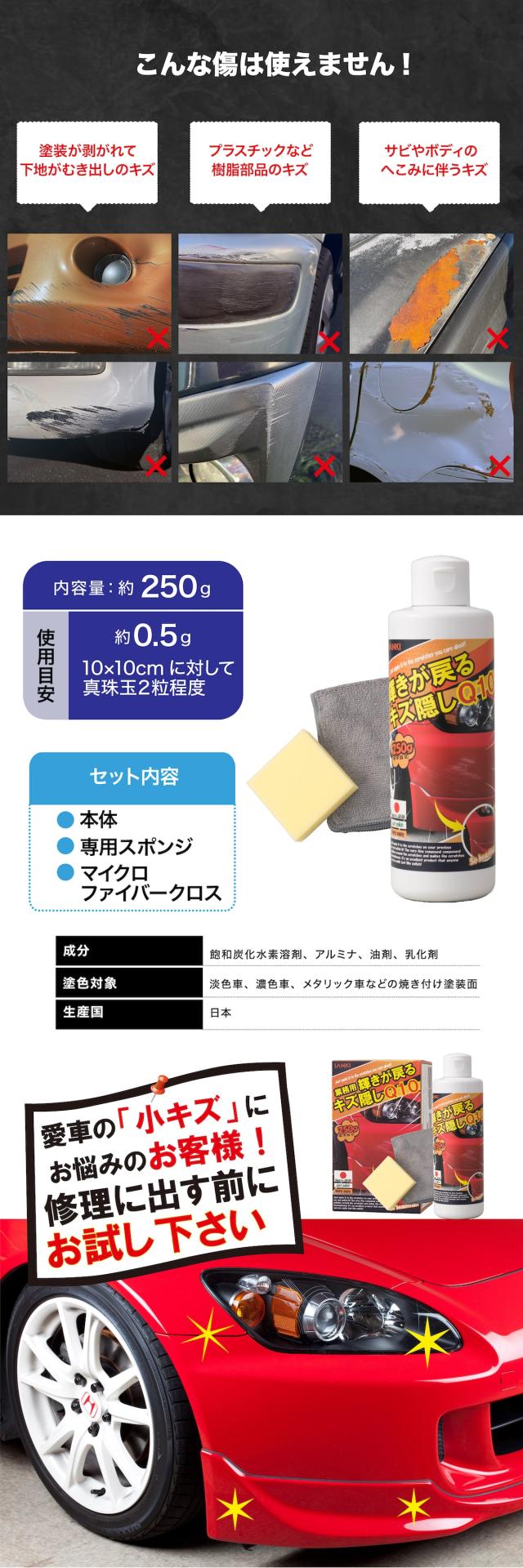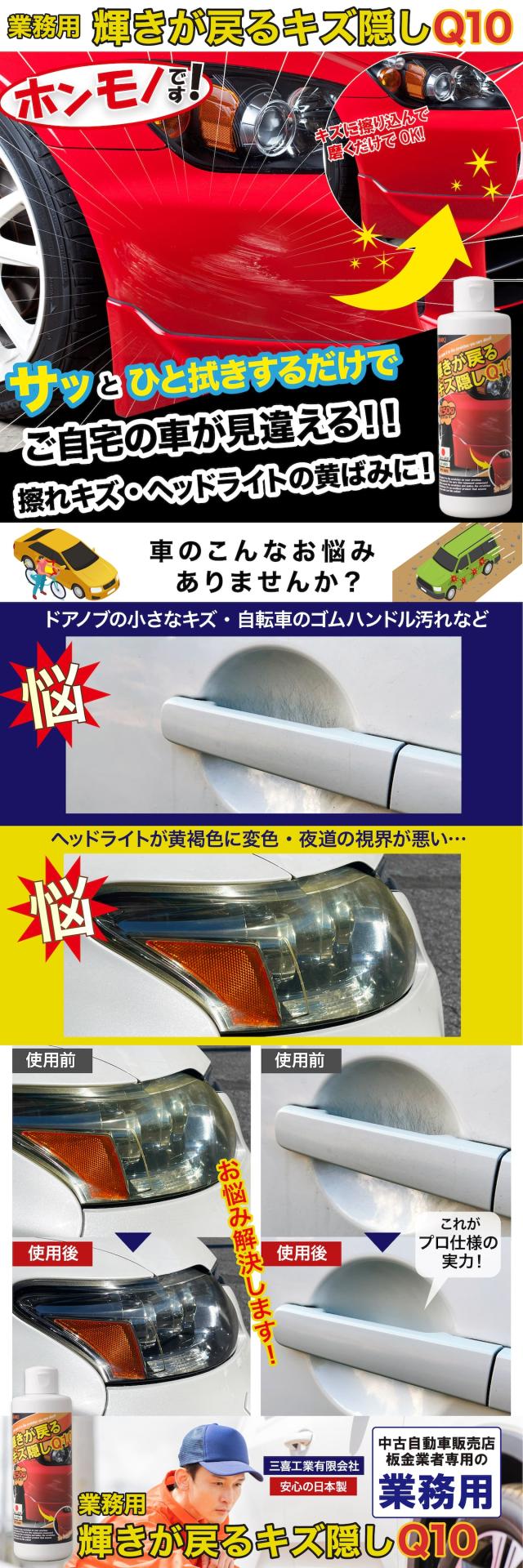 業務用 輝きが戻るキズ隠し Q10 自動車 車 クルマ 傷 キズ 傷隠し キズ隠し キズ隠す 傷消し キズ消し 埋める コンパウンド 業務用 修理 黒 白 赤 青 メタリック セルフ車 ヘッドライト 黄ばみ 黄褐色 修復 ヘッドライト磨き 曇り 明るく 三喜工業