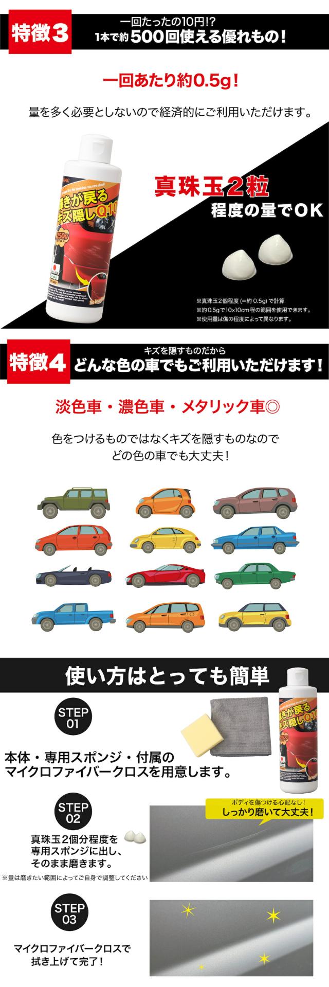 ・1本で約500回分!約10円で愛車が生まれ変わります。(※真珠玉2個程度(=0.5g)で計算※約0.5gで10×10cm程度の範囲を使用できます。