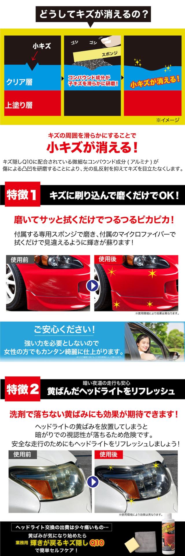 傷隠しQ10に配合されている平均粒径2マイクロメートルのコンパウンド成分がキズによる凸凹を研磨することにより、光の乱反射を抑え傷を目だたなくします。ボディを傷つけることがないからしっかり磨いて大丈夫!まるで新車に生まれ変わった!?かのようにピカピカに仕上がります。