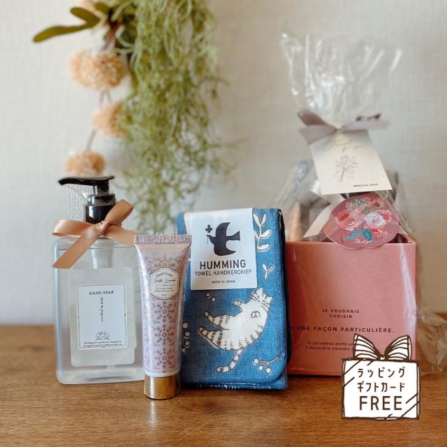 ハンドクリーム、ハンドソープと日本製タオルハンカチのギフトです。