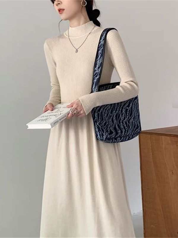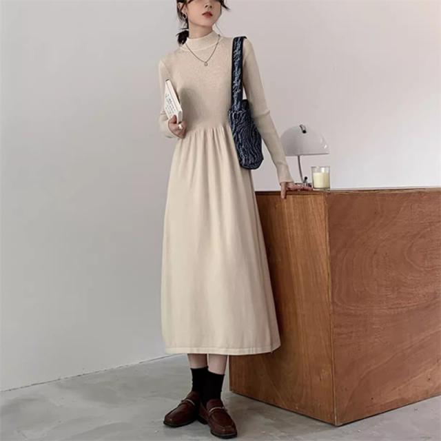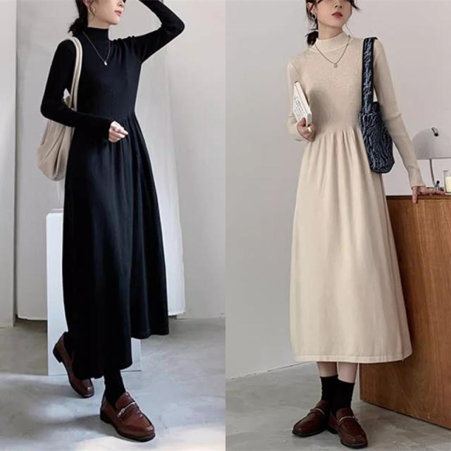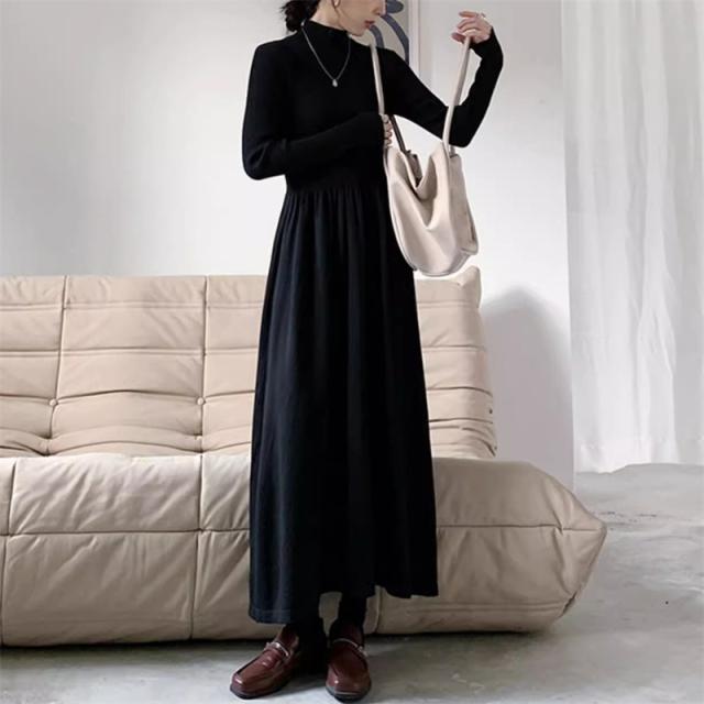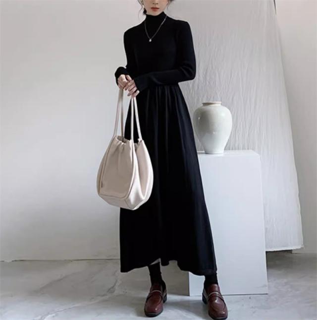 ハイネックワンピース 秋冬 レディース ニット ドロングワンピース 長袖 ストレッチ 103cm