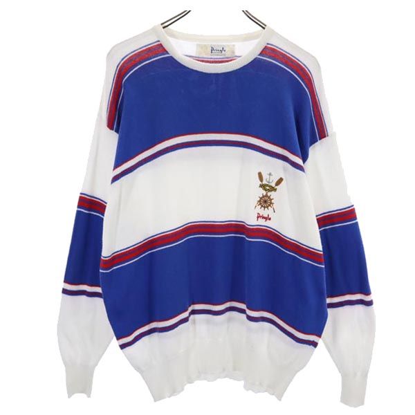 プリングルオブスコットランド 英国製 長袖 コットン ニット M 白×青 Pringle of Scotland ロゴ メンズ