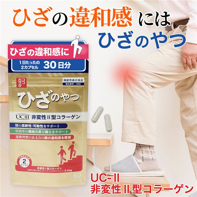 「ココカラダ ひざのやつ 非変性2型コラーゲン UC-II」は、機能性表示食品(届出番号 J506)として、ひざ関節の違和感の軽減し、柔軟性や可動性をサポートするサプリメントです。