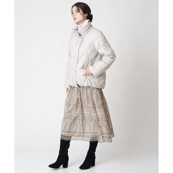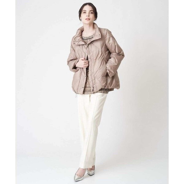 通常はダウンが下がらないように表側に横段ステッチを入れるのが主流ですが、仕様を工夫しエレガントな着こなしにも合うように、大きめのステッチデザインに仕立てました。 裾にはヒモの調節機能がついていますので、ドロストする(絞る)ことで、シルエットの変化、また防寒機能も備わった一着に。