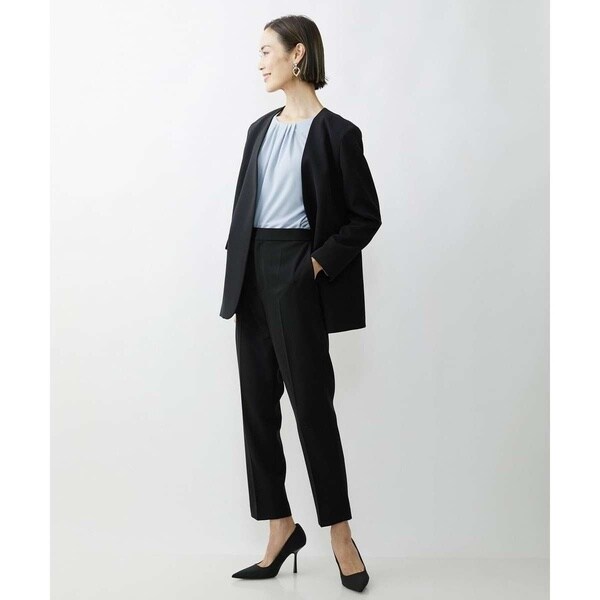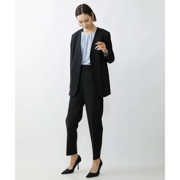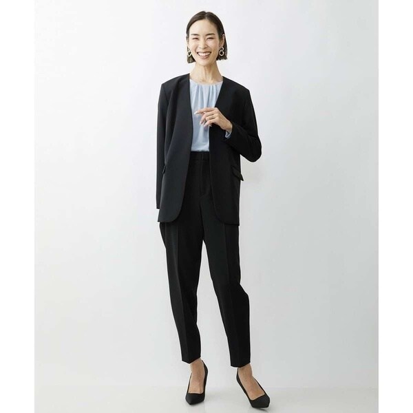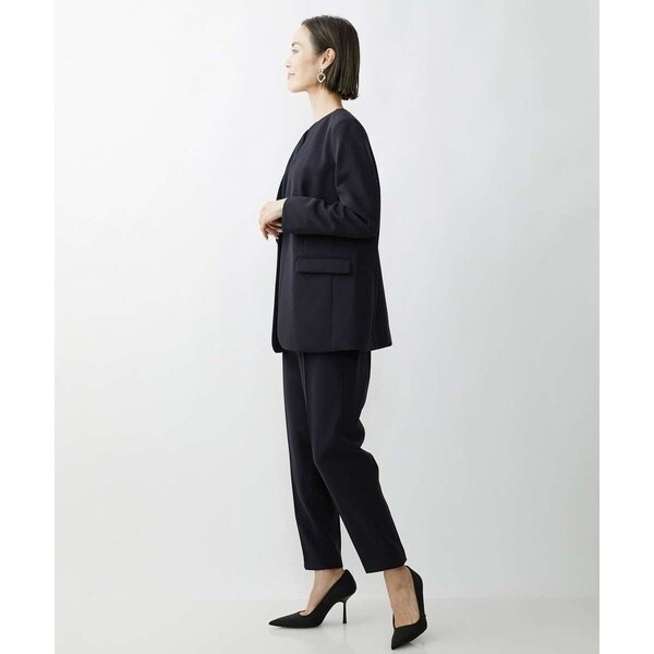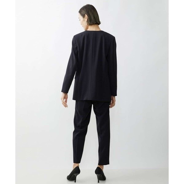 パンツに合うやや長めのレングス設定のノーカラージャケット。縦長のシルエットで、抜け感ときちんと感のバランスをとりながら スタイル良く見える様にこだわりました。前裾が開きずらく、ストンとしたシルエットに設計しています。ウエストの絞りも少なく、どんな骨格の方にもすっきりお召いただけます。