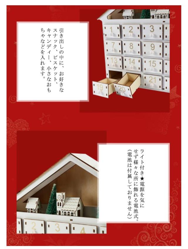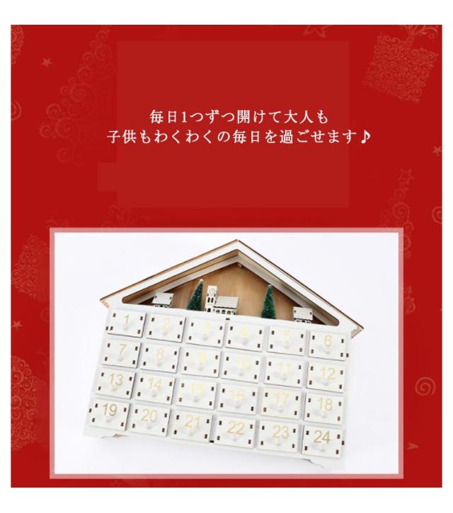 | 【商品名】アドベントカレンダー 【素材】木製 【サイズ】サイズ表 【特徴】 毎日1つずつ開けて大人も子供もわくわくの毎日を過ごせます♪ クリスマスを待つ間も楽しめる木製アドベントカレンダー♪ 引き出しの中に、お好きなスナック、ビスケット、キャンディー、小さなおもちゃなどを入れます。 12月1日からクリスマスまでの24日間をカウントダウンを楽しめます。 クリスマスが終わった後も収納アイテムとしてお使いいただけます。 クリスマスだけでなく、誕生日、記念日などイベントにもおすすめ! 木製なので毎年繰り返し使えます。 ライト付き★電源を気にせず様々な所に飾れる電池式。(電池は付属しておりません) | |