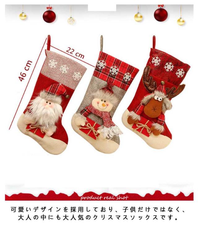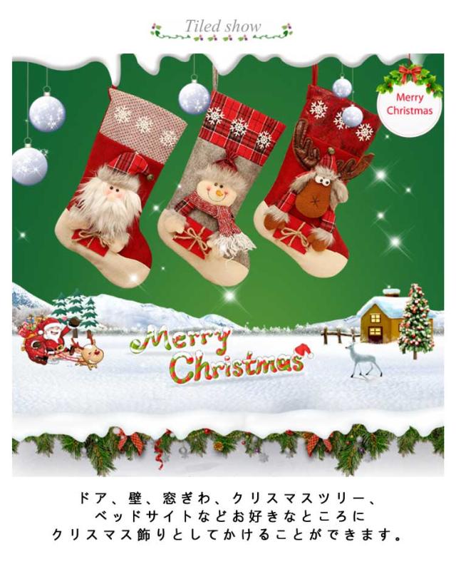 | クリスマスの雰囲気には欠かせない高品質なクリスマス靴下です。 ドア、壁、窓ぎわ、クリスマスツリー、ベッドサイトなどお好きなところにクリスマス飾りとしてかけることができます。 可愛いデザインを採用しており、子供だけではなく、大人の中にも大人気のクリスマスソックスです。 素敵なクリスマスプレゼントやデコレーションになりましょう。 | |