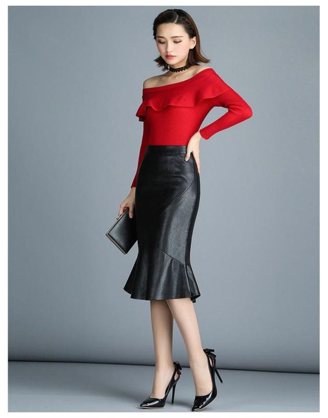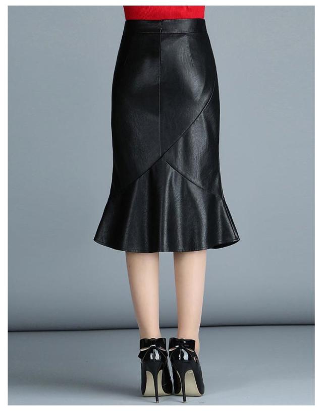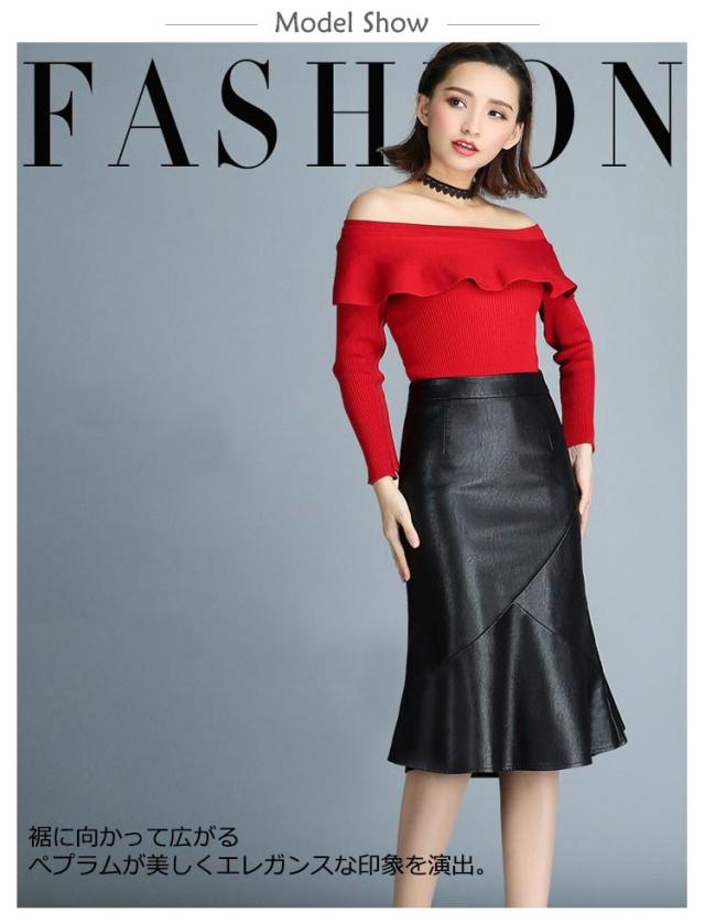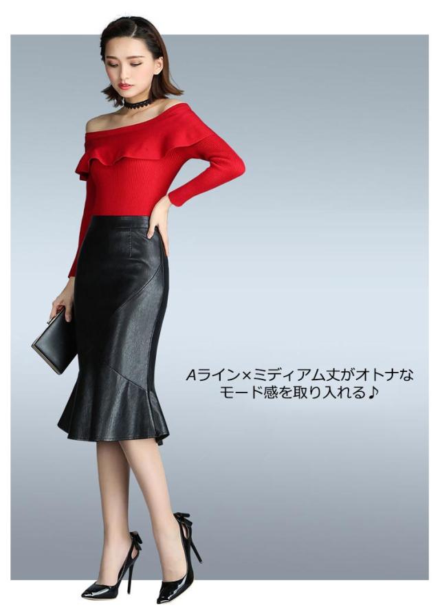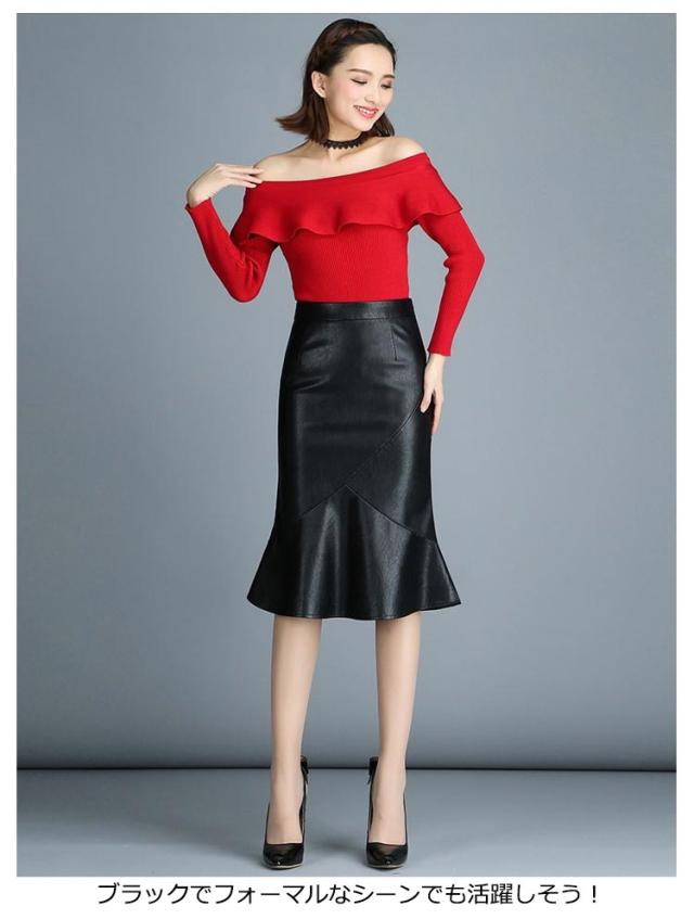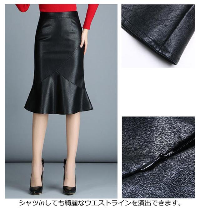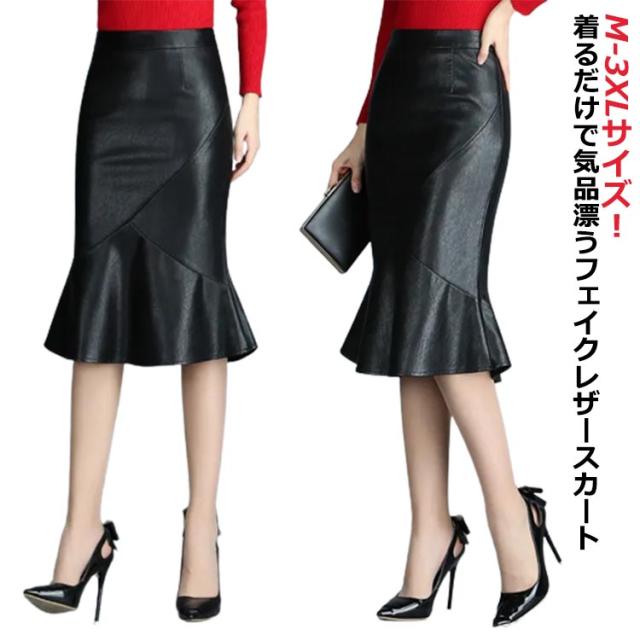 通勤 おしゃれ フレアスカート 着?せ 合皮 スカート 膝丈 無地 aライン ハイウエスト きれいめ タイトスカート 美脚 フェイクレザースカート フリル ギフト エレガント 秋冬 大きサイズ 大きいサイズ PU ブラック 黒 大人女性 プレゼント レザースカート