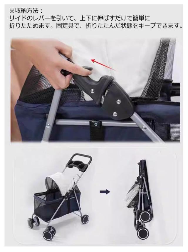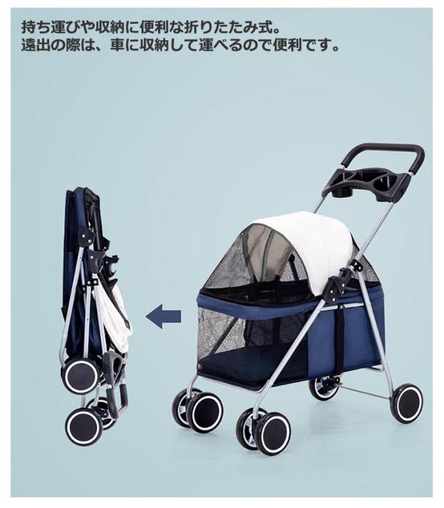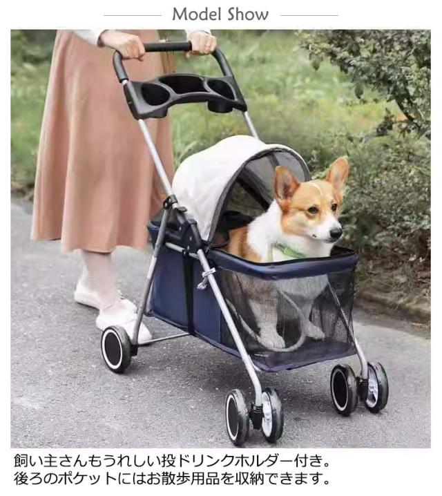 | 4輪タイプ&ストッパー付きだから安心?安全!犬猫兼用キャリーカート 視界と通気性の良いメッシュ構造でわんちゃんも快適。わんちゃんも飼い主さんと同じ景色を楽しめます。 使用場所や用途に合わせて前面カバーを開閉できます。 首輪のリングに取り付けられる、飛び出し防止リードが2つ付属。金属製のナスカンで脱着しやすい。 前輪は360°回転のダプルタイヤ。小回りが利いて快適に移動ができます。後輪にはストッパーが付いているので、停止時も安心です。足で踏むだけで簡単に固定することができます。 飼い主さんもうれしい投ドリンクホルダー付き。後ろのポケットにはお散歩用品を収納できます。 持ち運びや収納に便利な折りたたみ式。遠出の際は、車に収納して運べるので便利です。 ※収納方法:サイドのレバーを引いて、上下に伸ばすだけで簡単に折りたためます。固定具で、折りたたんだ状態をキープできます。 | |