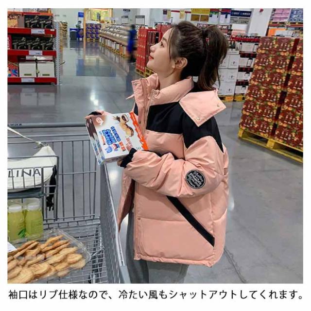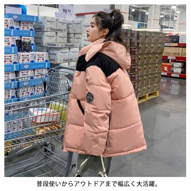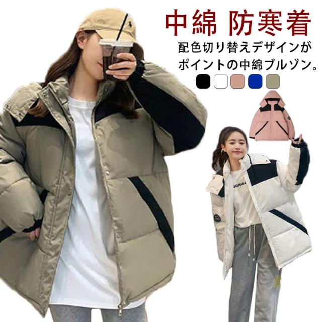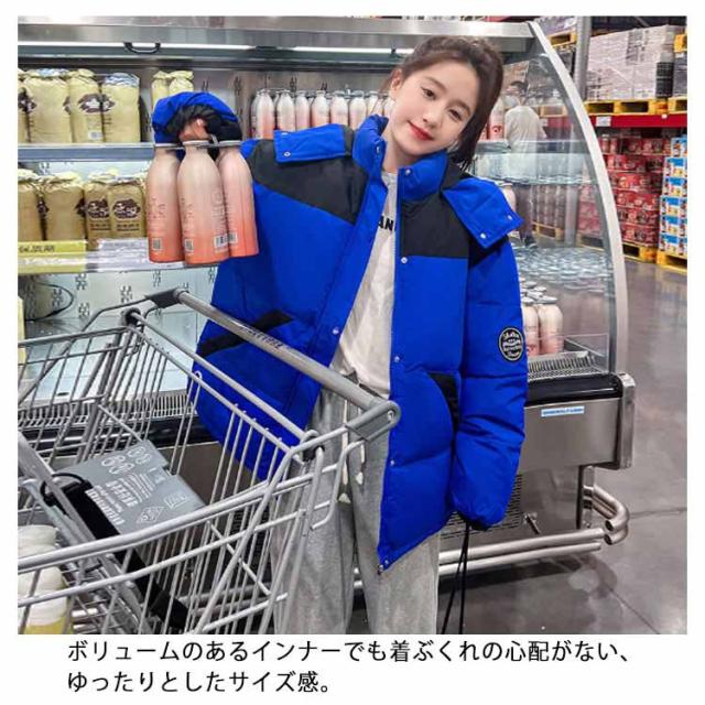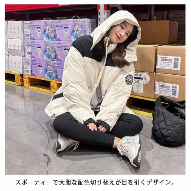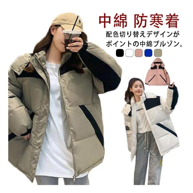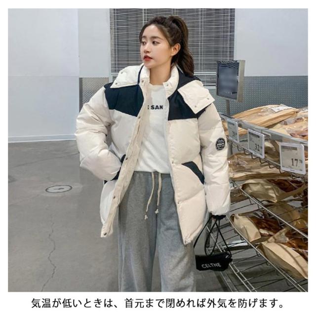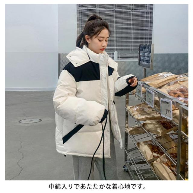 中綿ジャケット 配色 レディース 中綿 ブルゾン ジャケット フード付き ダウンジャケット ダウンコート ショート丈 秋冬 アウター 中綿入り 軽量 厚手 あたっか 防寒 保温 中綿コート 防寒着 ボリューム ゆったり オーバーサイズ フェイクダウン 【送無】