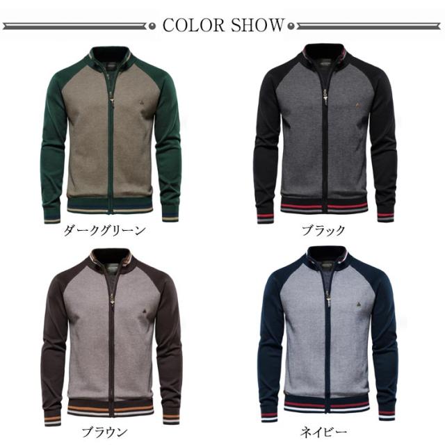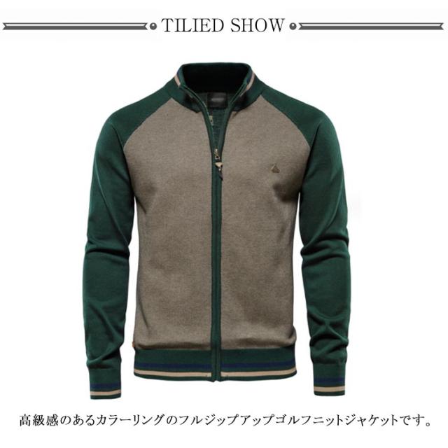 ゴルフウェア メンズ ニットジャケット ニット セーター カーディガン フルジップアップ 長袖 ジップアップ 立ち襟 スタンドカラー ライン ファスナー 配色 綿 コットン トップス 春 秋 冬