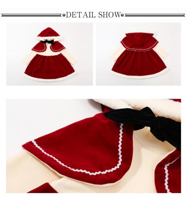 | ・クリスマスにピッタリ!ケープ付きのワンピース ・フード付きのケープはリボンで結ぶと可愛い印象に! ・ワンピースだけでも大人っぽく着られます。 ・記念撮影やクリスマスパーテイにもおすすめです。 | |
