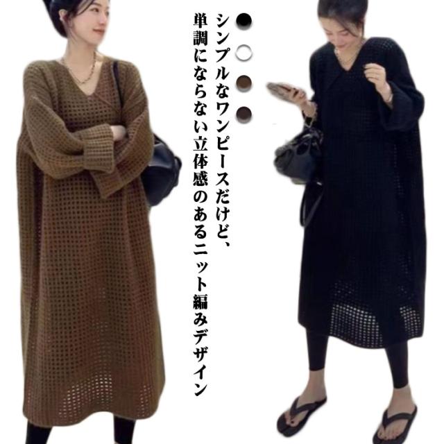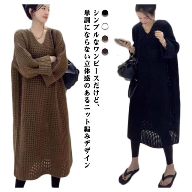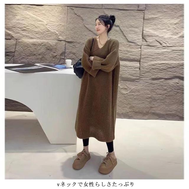 ニットワンピース ワンピース レディース vネック ニット ロングワンピース ロング 長袖 大きいサイズ ニットワンピース 送料無料 オシャレ レイヤードコーデ 無地 大きいサイズ ミモレ丈 ミモレワンピース