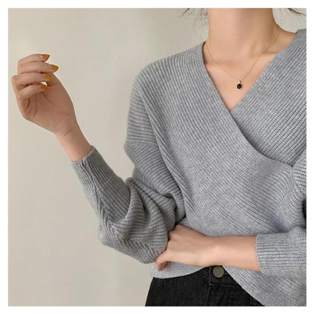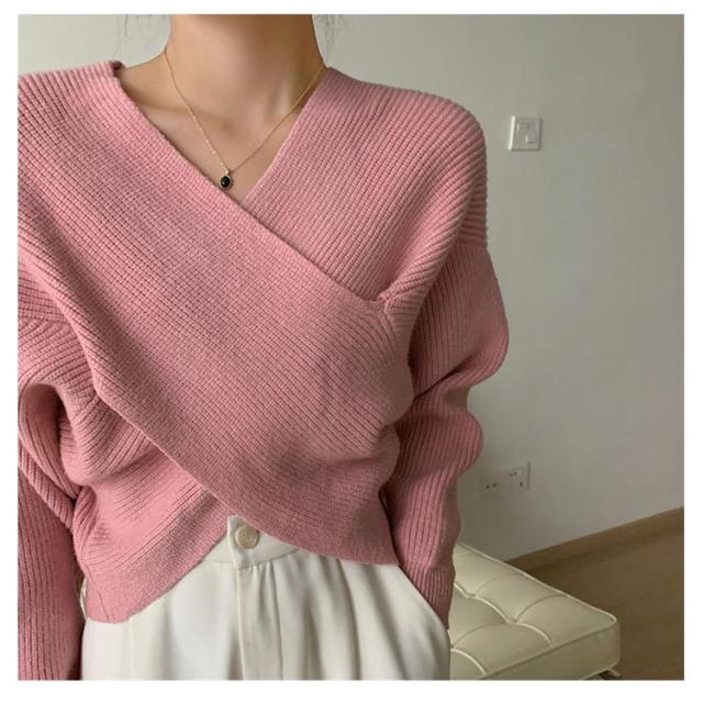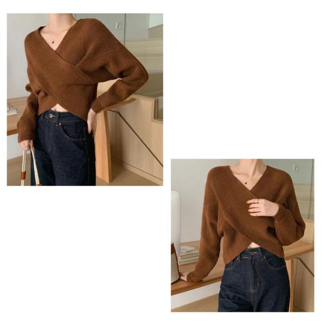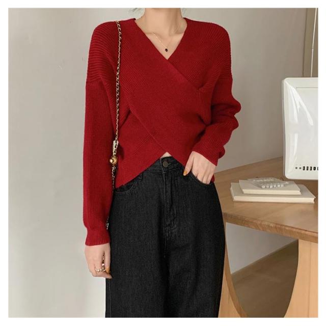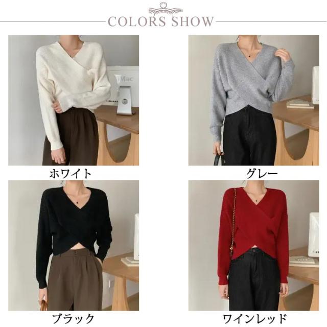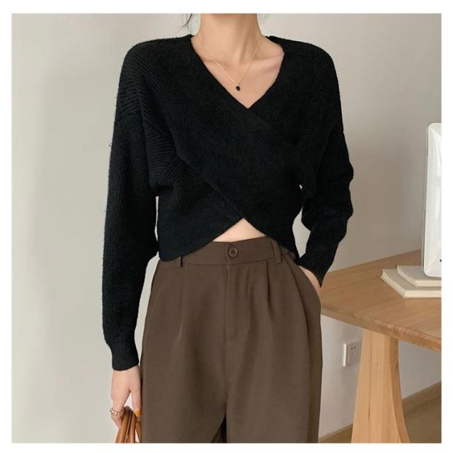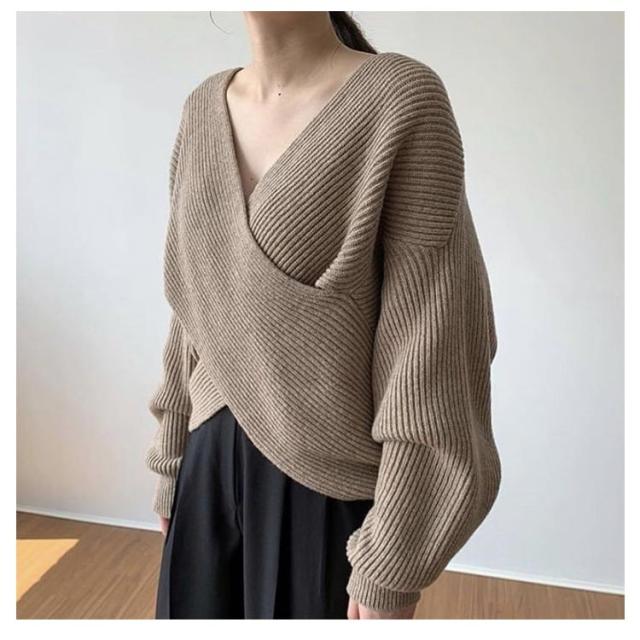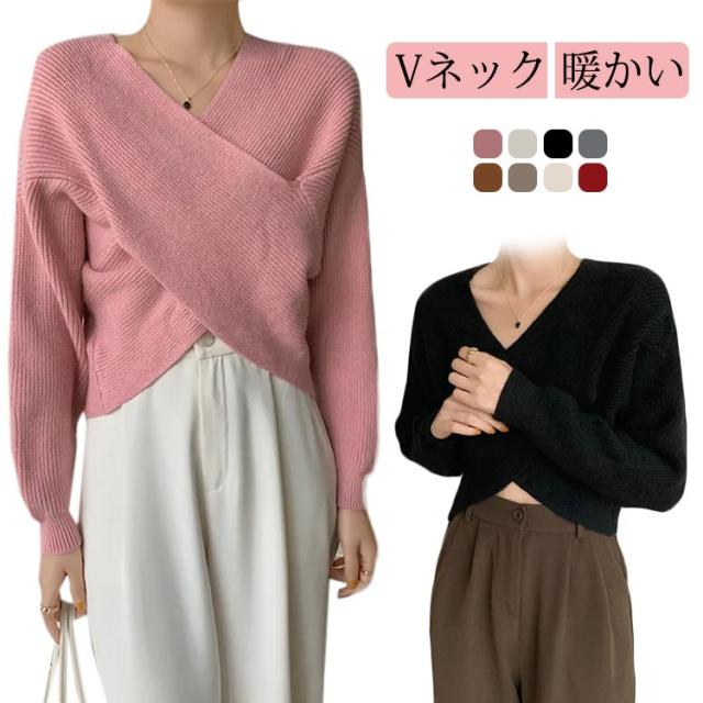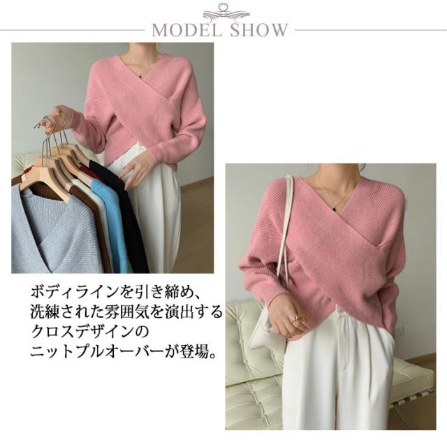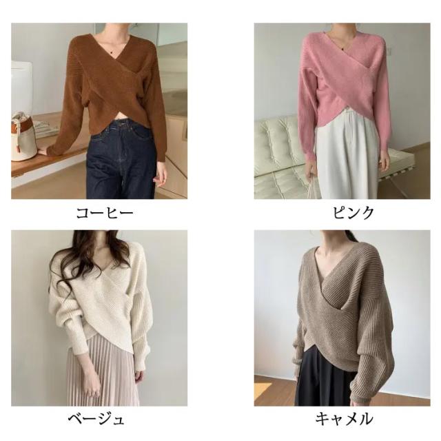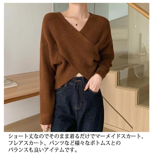 ウール混Vネッククロスニット クロスニット レディース トップス ニット Vネック カシュクール クロス 長袖 クロップド ウール混 カシミヤ セーター 秋 冬 暖かい リブ ドロップショルダー ルーズフィット ニットプルオーバー 無地 フェミニン 上品 韓国ファッション