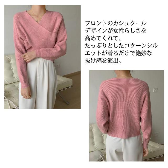 | ボディラインを引き締め、洗練された雰囲気を演出するクロスデザインのニットプルオーバーが登場。 フロントのカシュクールデザインが女性らしさを高めてくれて、たっぷりとしたコクーンシルエットが着るだけで絶妙な抜け感を演出。 ショート丈なのでそのまま着るだけでマーメイドスカート、フレアスカート、パンツなど様々なボトムスとのバランスも良いアイテムです。 タートルネックやシャツをレイヤードしてカジュアルな着こなしも◎ | |